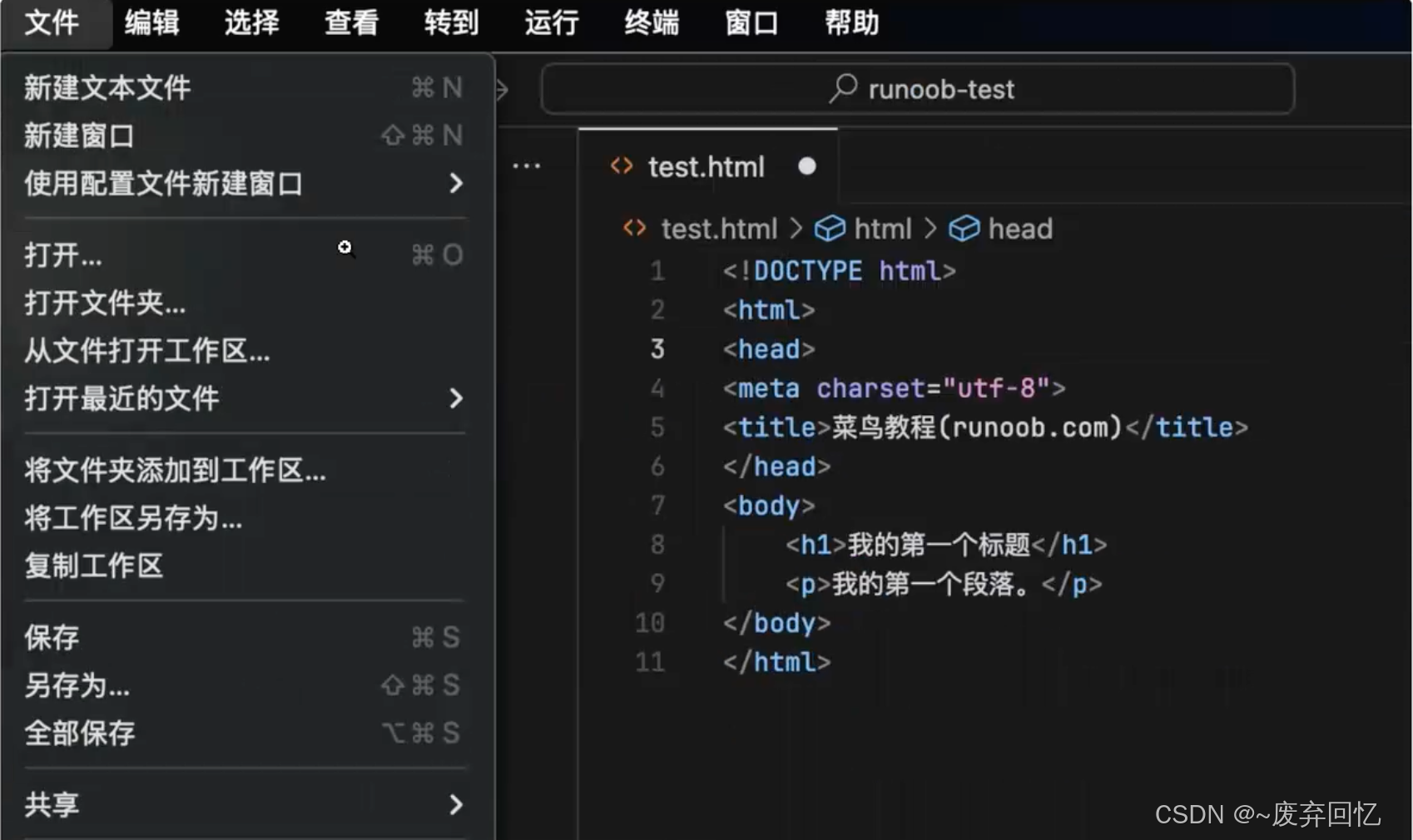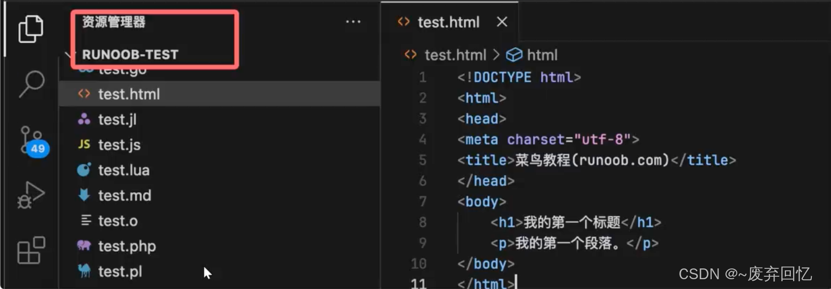 我们也可以打开一个已存在的文件或者目录(文件夹),比如我们打开一个runoob-test,打开该目录后,它就会显示在资源管理器中: