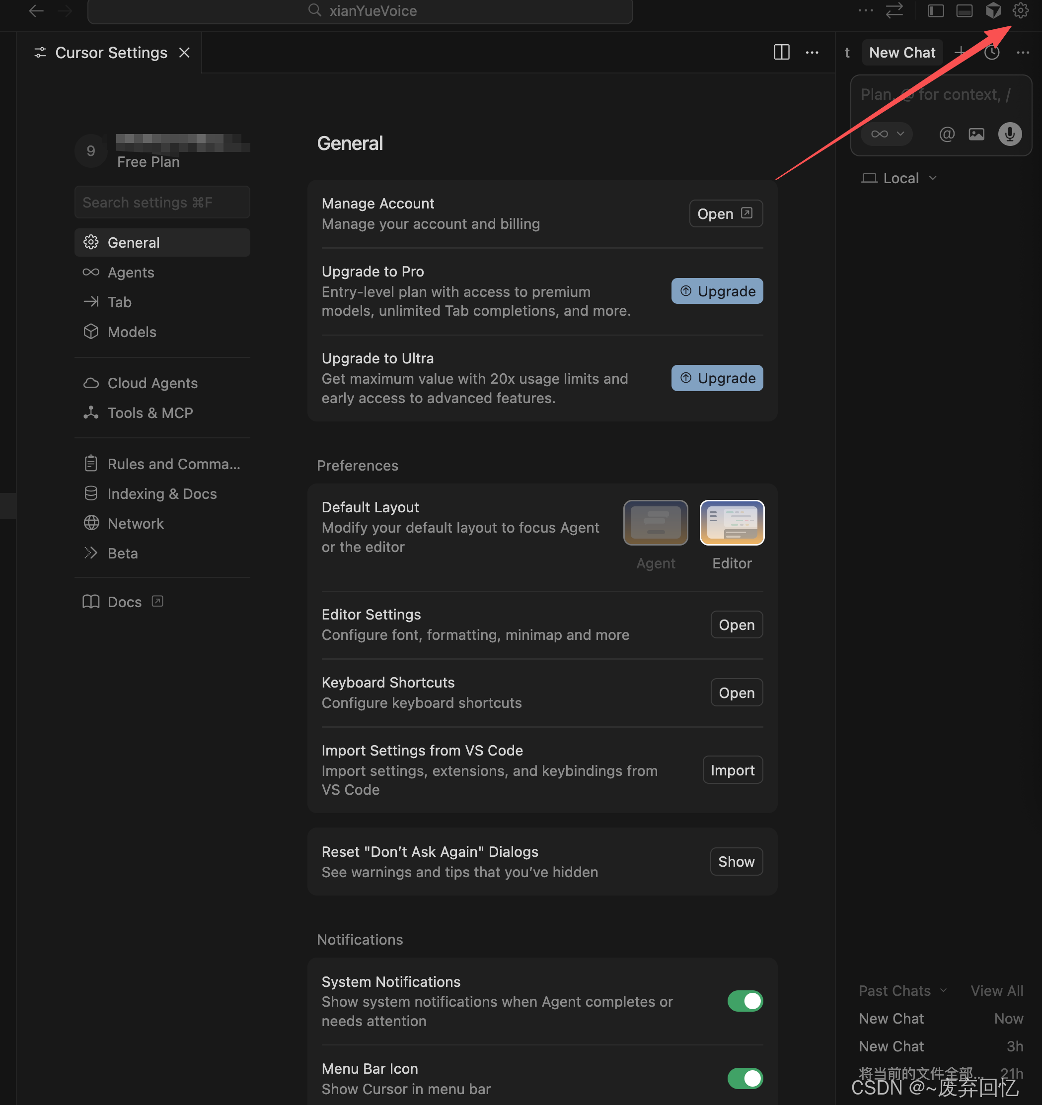 点击右上角的齿轮按钮,或按下快捷键 Ctrl/command+Shift + J,即可打开 Cursor的专属设置面板.
