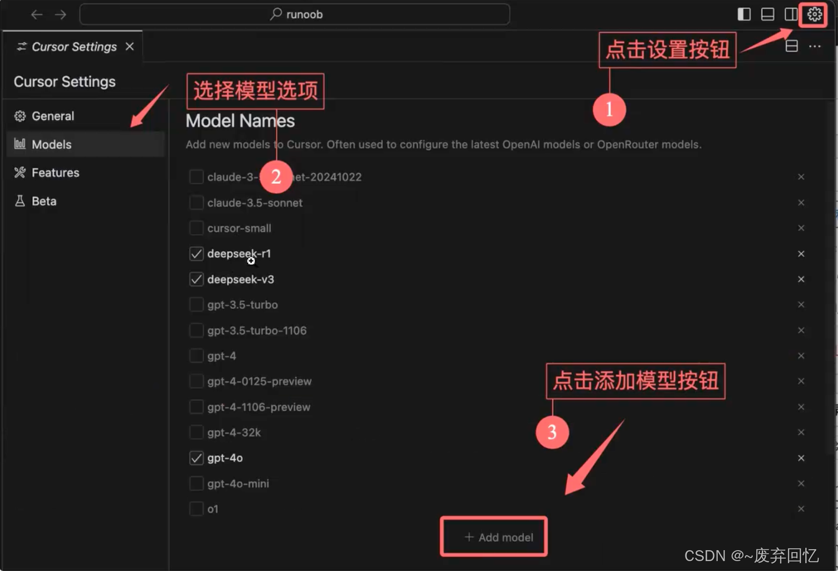 Cursor内置了很多大模型,当然我们可以自定义设置模型,设置也非常简单的.