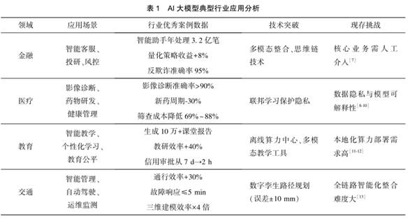 当前,AI 大模型已深度渗透金融、医疗、教育、交通等关键领域,释放出显著的产业价值与技术潜力。如表 1 所示,在金融领域,智能客服与风控系统的高效运转,印证了多模态整合与思维链技术的成熟应用,然而核心决策环节仍需人工介入;在医疗领域,依托联邦学习等技术突破,AI 在影像诊断、药物研发等场景取得阶段性成果,但数据隐私保护与模型决策可解释性仍是亟待突破的关键瓶颈;在教育领域,借助离线算力中心与多模态工具,AI 实现了教学效率的跃升,而本地化算力的刚性需求,成为制约其规模化落地的核心因素;在交通领域,数字孪生技术的应用显著提升运维效率,但全链路智能化协同整合仍需突破技术壁垒。