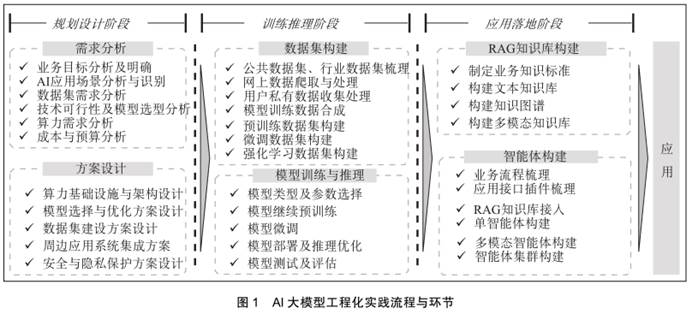 AI大模型工程化落地的整体流程,涵盖规划设计、训练推理与应用落地三大核心阶段(如图1所示)。