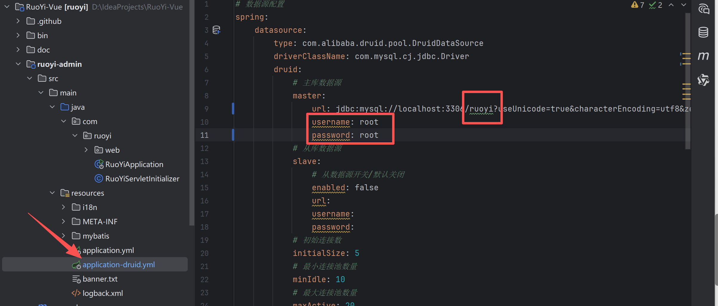 找到ruoyi-admin当中配置数据库的配置文件application-druid.yaml文件