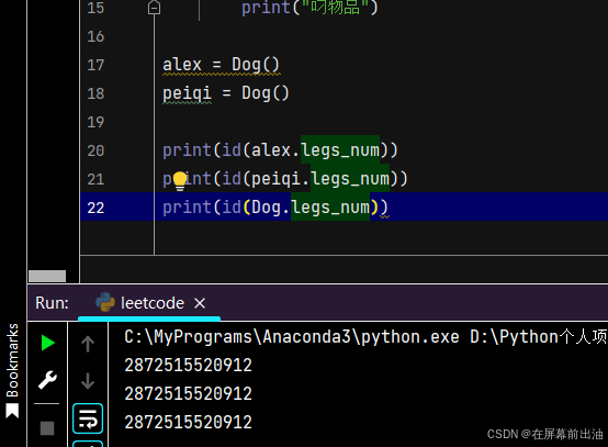 会发现这两个属性分别所对应的内存地址是一样的,其实就是Dog类属性legs_num所对应的内存地址。