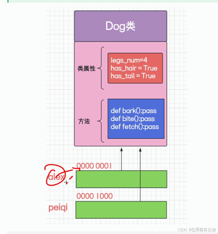 那么alex实例对象的内存空间便多了这个属性,同时不影响Dog类原来的属性,也不影响peiqi这个实例对象的属性。但是如果再次执行: