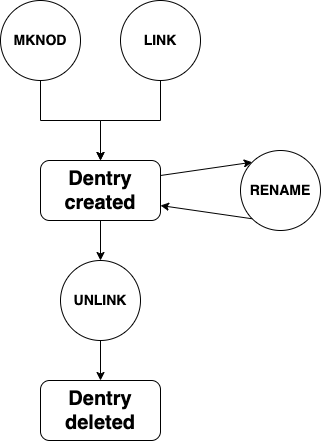 目录项的生命周期 Dentry是一个指向目标目录的硬链接。inode文件系统在执行 `get_dir()` 时创建第一个这样的链接。调用 `link()`inode函数会创建其他硬链接。调用`rename()`函数会修改硬链接,调用`unlink()`函数会移除硬链接。移除硬链接并不会立即移除目标目录,因为已打开的文件描述符可能仍然引用没有硬链接的目录项。inodeinode