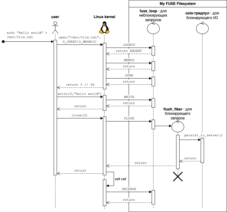 在单个光纤中对 FUSE 请求进行非阻塞同步处理,并在单独的光纤中处理阻塞处理程序。这是我最终确定的模型,目前为止运行良好,可以投入使用。