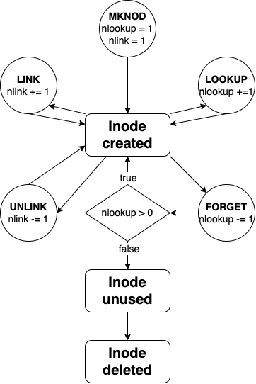 在步骤 4 之后不要删除它inode,它可能仍在被打开的文件使用。Inode当操作系统发送完所有 FORGET 请求后,它将被异步删除。