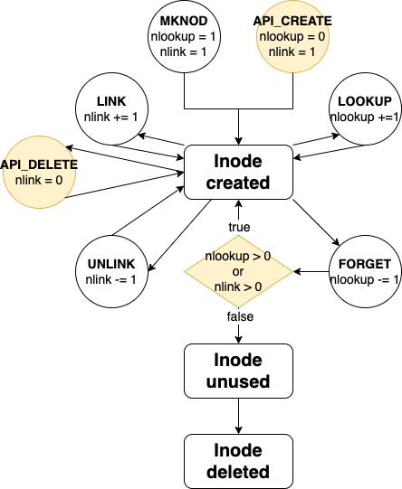 考虑到文件系统发起的 API 操作的生命周期inode,与一般生命周期的区别用黄色标记。