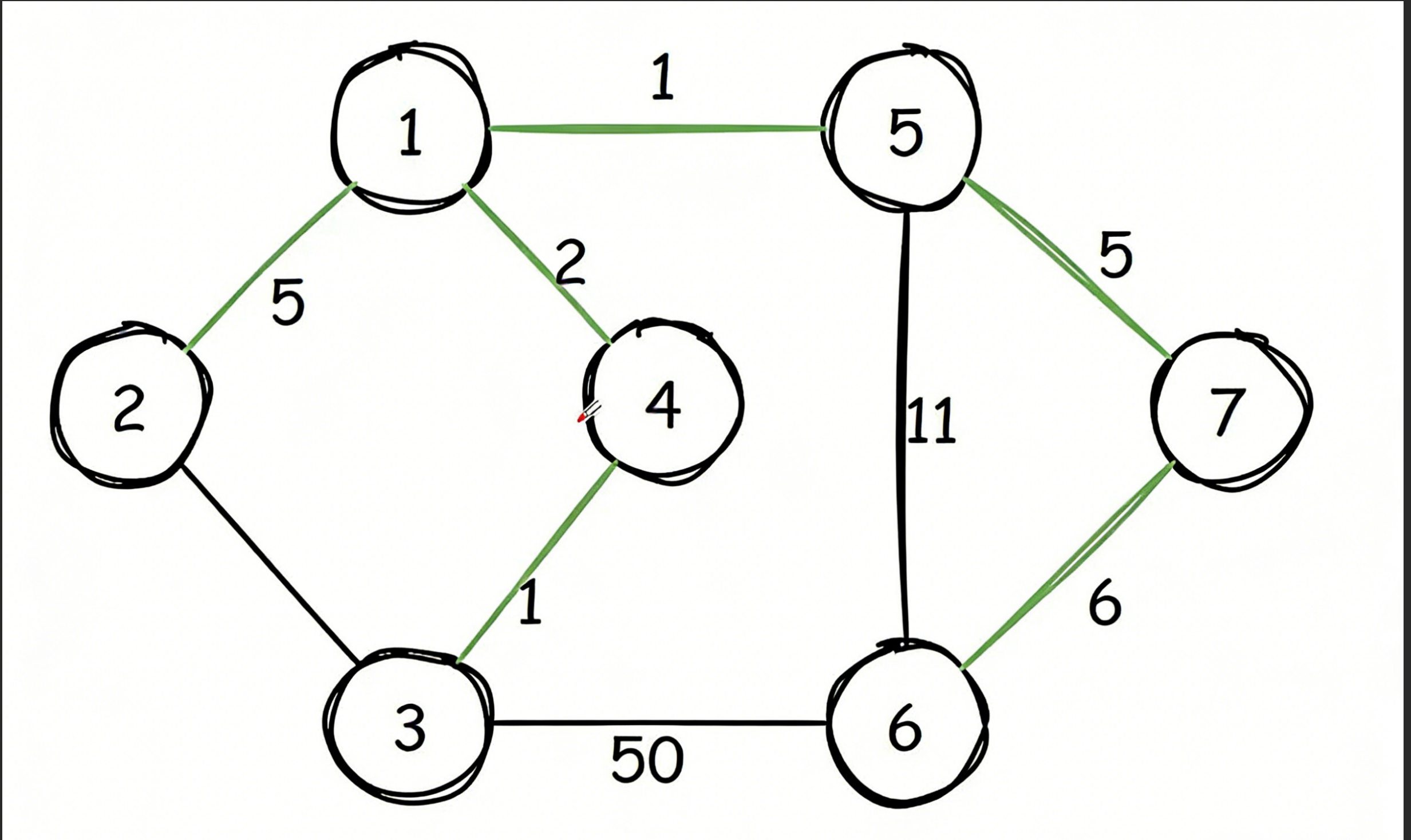 贪心策略的核心逻辑:为了构建总权值最小的生成树,我们要尽可能优先选择权值小的边,同时避免形成回路。