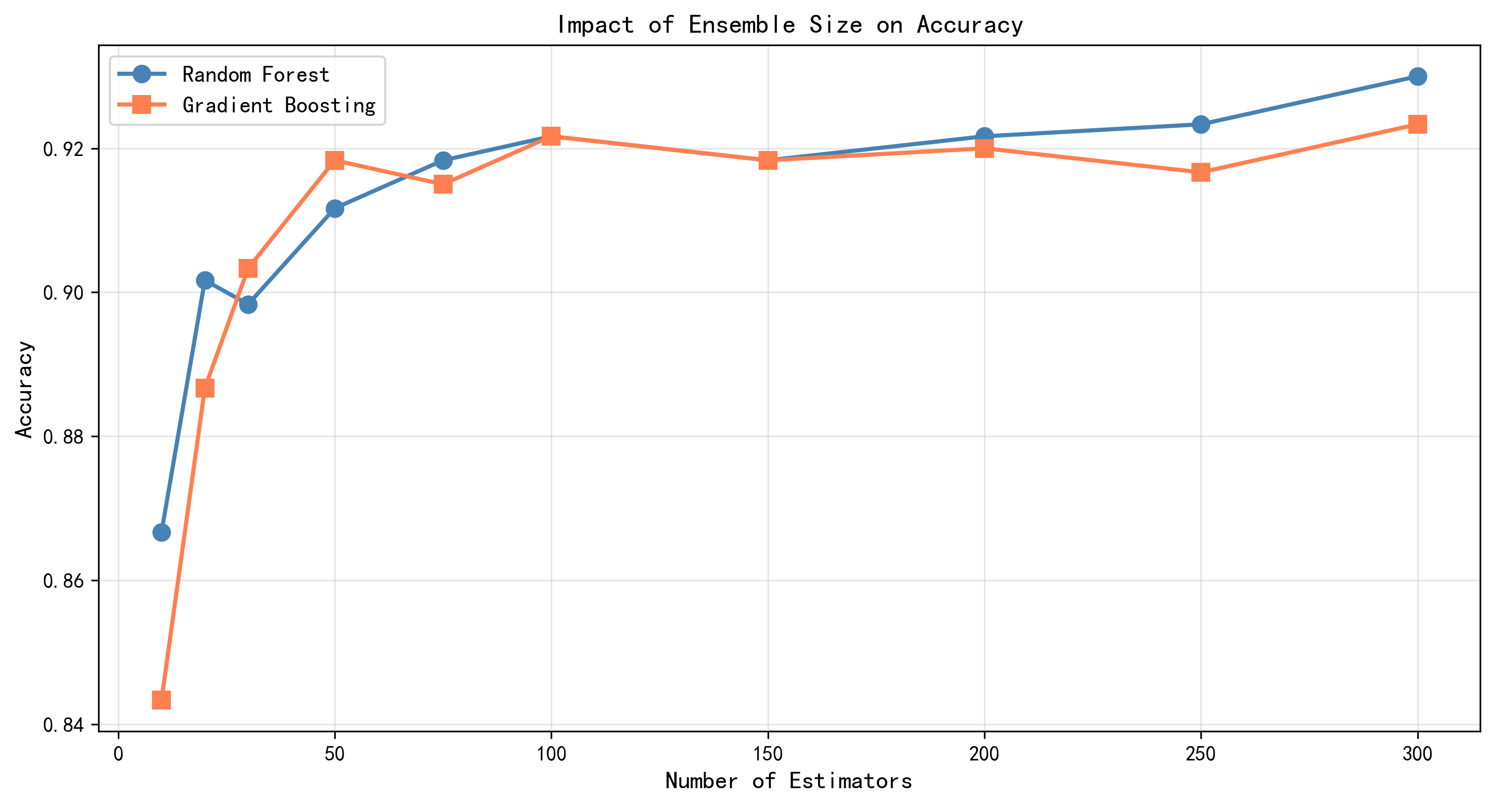 随机森林模型表现出了显著的改进。随着树数量从50增加到100,测试集准确率从91.17%提升到92.17%,但继续增加到200棵树时,测试集准确率保持在92.17%,这表明存在一个收益递减的现象。更重要的是,随机森林有效地控制了过拟合------50棵树的随机森林训练集准确率为100%,而测试集准确率达到91.17%,训练-测试准确率之间的差距仅为8.83%,远小于单个决策树的21.63%。这一观察充分说明了Bagging方法通过组合多个树来降低方差的有效性。