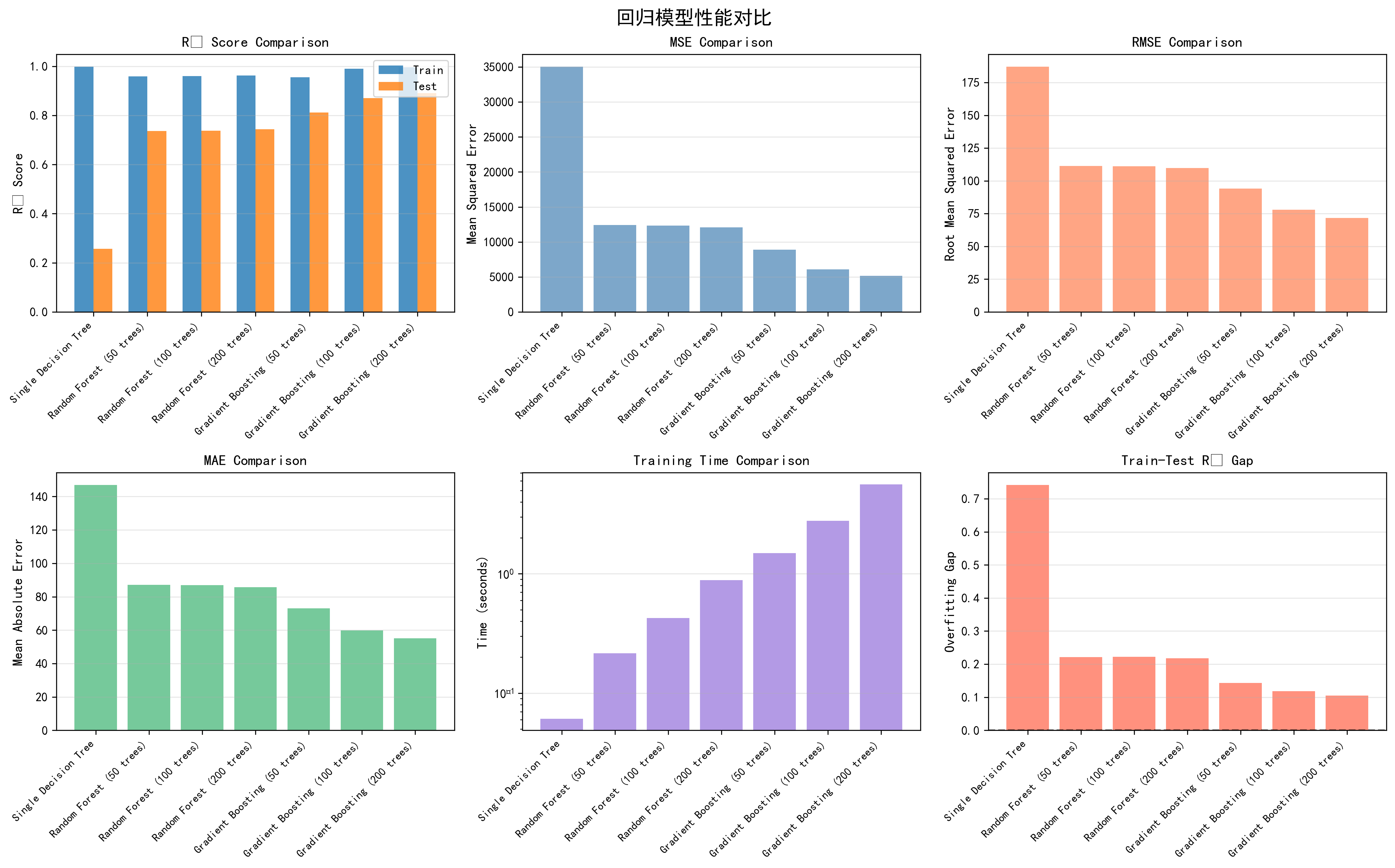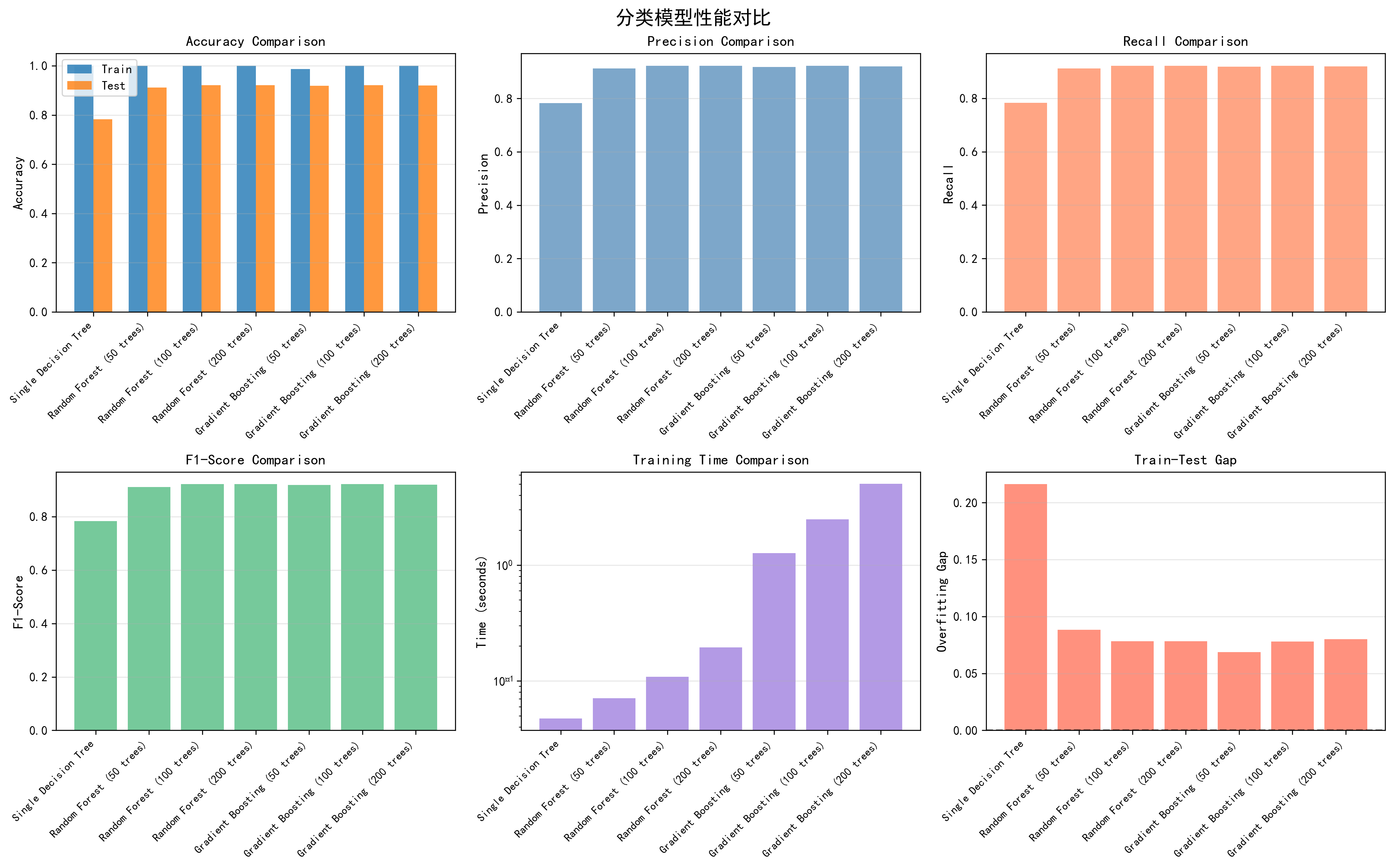 表4-1展示了分类任务中各个模型在训练集和测试集上的性能指标。从准确率的角度看,单个决策树在训练集上达到99.96%,但在测试集上仅为78.33%,这反映出单个决策树在该数据集上存在严重的过拟合问题。这种高度的过拟合现象完全验证了决策树作为高方差模型的特性,也为采用集成学习方法来降低方差提供了强有力的动机。
