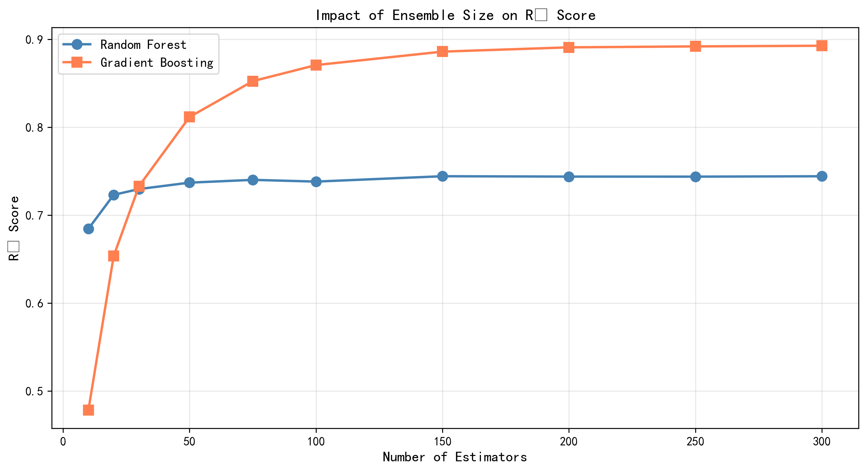 为了全面评估Bagging和Boosting两种集成学习方法的性能,我们在合成分类数据集上进行了系统的实验。该数据集包含3000个样本,其中2400个用于训练,600个用于测试,共25个特征。数据集的特征维度和样本规模都是相对真实的机器学习应用场景的代表。我们选择了单个决策树作为基准模型,以及三种规模的随机森林(50、100、200棵树)和三种规模的梯度提升模型(50、100、200棵树)进行对比。
