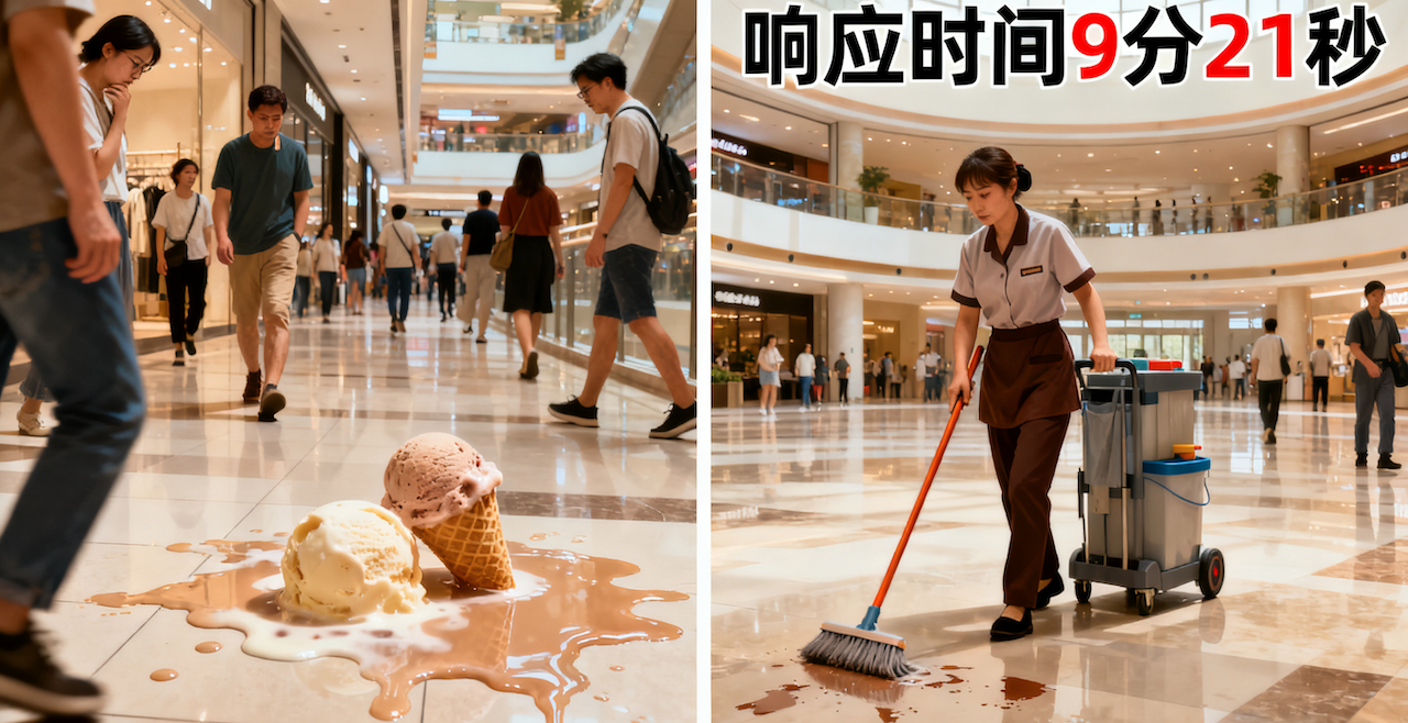 - 保洁阿姨1人管3000平,靠肉眼发现,平均响应时间9分21秒;