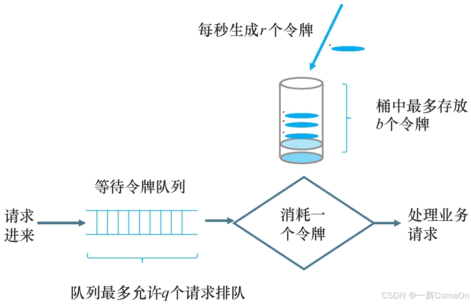 - 每个请求到达时,必须获取并消耗一个令牌才能被处理。
