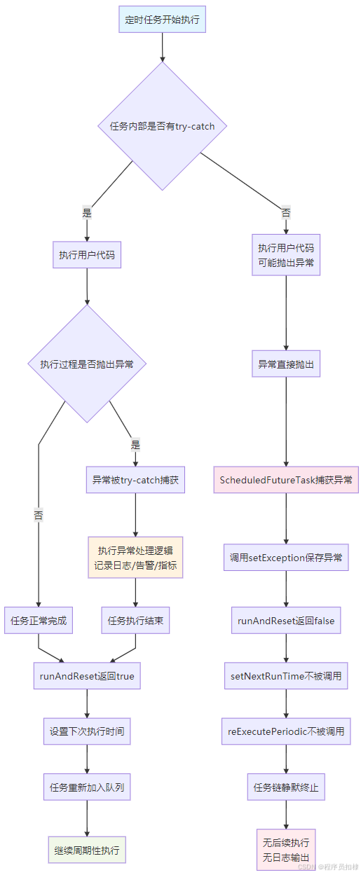 避免异常传播失控:如果一个周期性任务不断抛出异常,继续调度可能会导致大量异常堆积,影响系统稳定性。