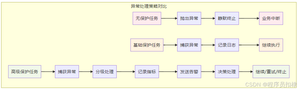 | 关键业务任务 | 捕获异常 + 告警 + 自动恢复 | 业务连续性最重要 |