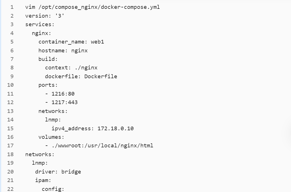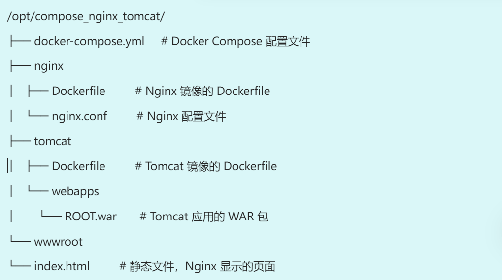 接下来,我们编写 docker-compose.yml 配置文件,定义 Nginx 和 Tomcat 两个服务。以下是一个完整的示例: