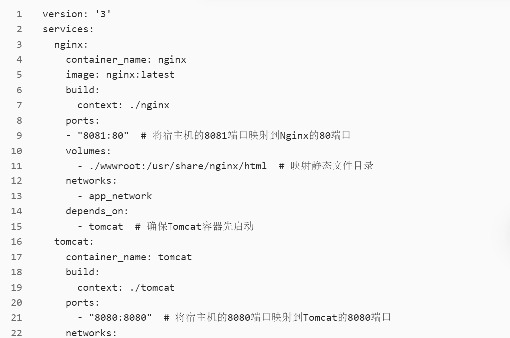 - depends_on 确保 Nginx 服务启动时,Tomcat 服务已启动并运行。