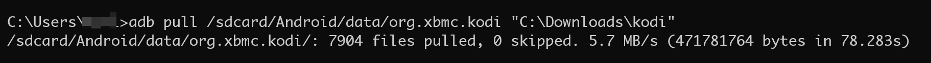 首先,我们连接上待备份的设备,使用如下命令可以将 Kodi 的全部数据提取到电脑上(将 $folder 替换为电脑上的指定位置):