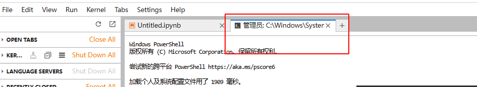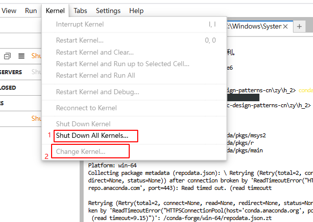 然后页中切换内核,首先是停止所有的内核,然后选择change kernel,选择你命名为Python (数据分析)的内核,然后就可以在jupyterlab中使用之前创建的虚拟环境了!