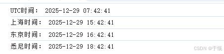 // 全球时间的统一基准 const utctime = dayjs.utc().unix() console.log('UTC时间:', dayjs.utc(utctime * 1000).format('YYYY-MM-DD HH:mm:ss')) // 上面一定要使用utc方法,否则dayjs默认会按本地时区解析 console.log('上海时间:', dayjs(utctime * 1000).tz('Asia/Shanghai').format('YYYY-MM-DD HH:mm:ss')) console.log('东京时间:', dayjs(utctime * 1000).tz('Asia/Tokyo').format('YYYY-MM-DD HH:mm:ss')) console.log('悉尼时间:', dayjs(utctime * 1000).tz('Australia/Sydney').format('YYYY-MM-DD HH:mm:ss'))