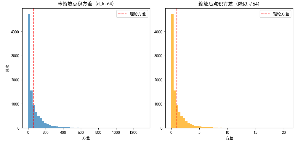 plt.title(f"缩放后点积方差 (除以√{d_k})")