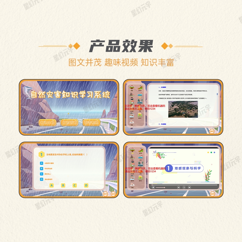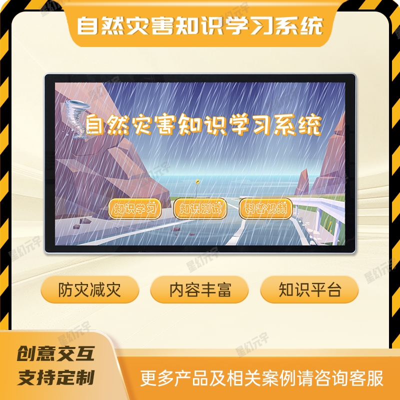 模块围绕11种灾害知识要点,设计选择、判断、简答等多样题型,全面覆盖灾害定义、成因、防灾措施、灾后处理等核心知识点。体验者可根据学习进度选择单一灾种专项测试或多灾种综合测试,测试完成后系统即时给出评分与详细解析,指出不足并链接对应知识点,方便查漏补缺、针对性复习。通过反复测试,强化知识记忆,提升知识应用转化能力。