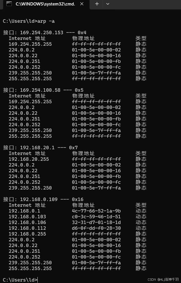 arp -a IP:如果我们有多个网卡,那么使用arp -a 加上接口的IP地址,就可以只显示与该接口相关的 ARP 缓存项目。