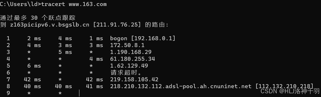 (4)利用路由跟踪命令tracert,跟踪到达某个网站(如www.163.com)的路由信息。