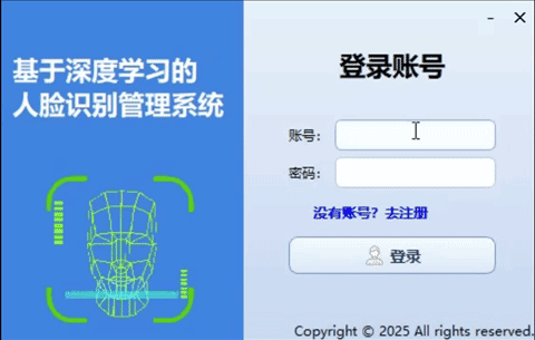 在注册流程中,用户需填写账号和密码,并通过二次密码确认后才能完成注册操作。若两次密码不一致或信息未填写完整,系统会给予明确提示,指导用户正确操作。注册成功后,用户即可切换至登录界面进行登录。整个登录注册界面底部统一展示 "Copyright © 2025 All rights reserved.",体现了系统的专业性与完整性。