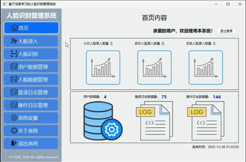 在左侧导航栏中,系统提供了多个可勾选的工具按钮,并为每个按钮精心设计了对应的提示图标和文字说明,帮助用户在无需额外学习的情况下,直观理解各功能的用途。导航按钮涵盖了首页、人脸录入、人脸识别、用户数据管理、人脸数据管理、登录日志管理、操作日志管理以及系统设置等核心模块。每一个按钮都与右侧的独立功能页面一一对应,确保功能划分明确、结构清晰。
