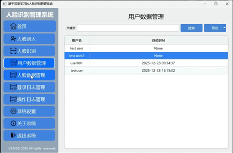 在数据层面,系统基于 SQLite 数据库对用户信息、人脸特征数据以及登录与操作日志进行统一管理,支持查询、编辑、删除及多格式导出操作,保障了数据的安全性、可追溯性与可维护性。同时,通过登录鉴权、重复人脸校验、身份证唯一性校验及操作日志记录等机制,进一步提升了系统的安全防护能力。系统还引入参数化配置与界面个性化设置,使用户能够根据实际需求灵活调整显示与交互行为。
