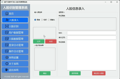 在人脸录入界面中,系统为用户提供了三种灵活的数据源输入方式,分别为图像、视频以及实时摄像头采集,以满足不同使用场景下的人脸数据录入需求。当用户选择"图像"作为输入来源时,需要从本地设备中选择一张包含清晰人脸的图片作为录入素材。系统在接收到图像后,会自动调用底层人脸识别引擎,对图像进行分析处理,并准确定位人脸区域,将识别到的人脸位置以标注的形式展示在对应的 label 标签中,供用户进行直观确认。