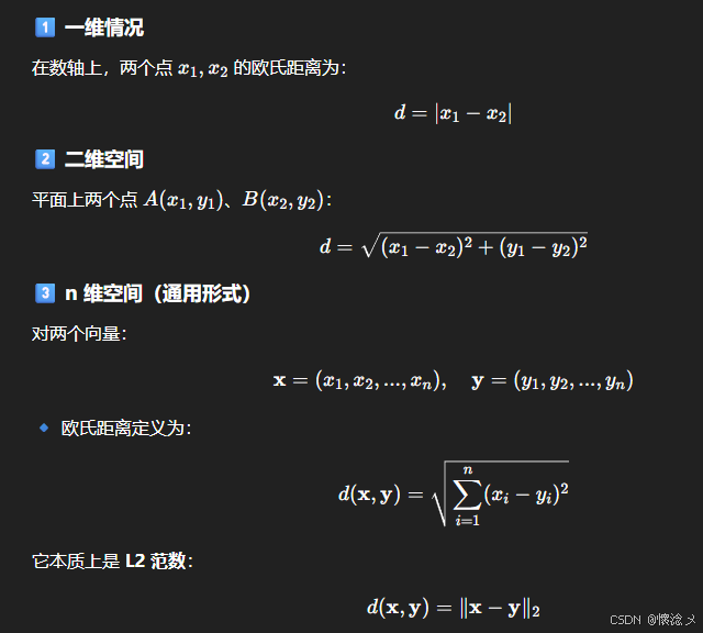 欧氏距离(Euclidean Distance) 是最常见、最直观的一种距离度量方式,用来衡量两个点在欧几里得空间中的"直线距离",可以理解为"尺子量出来的距离"。