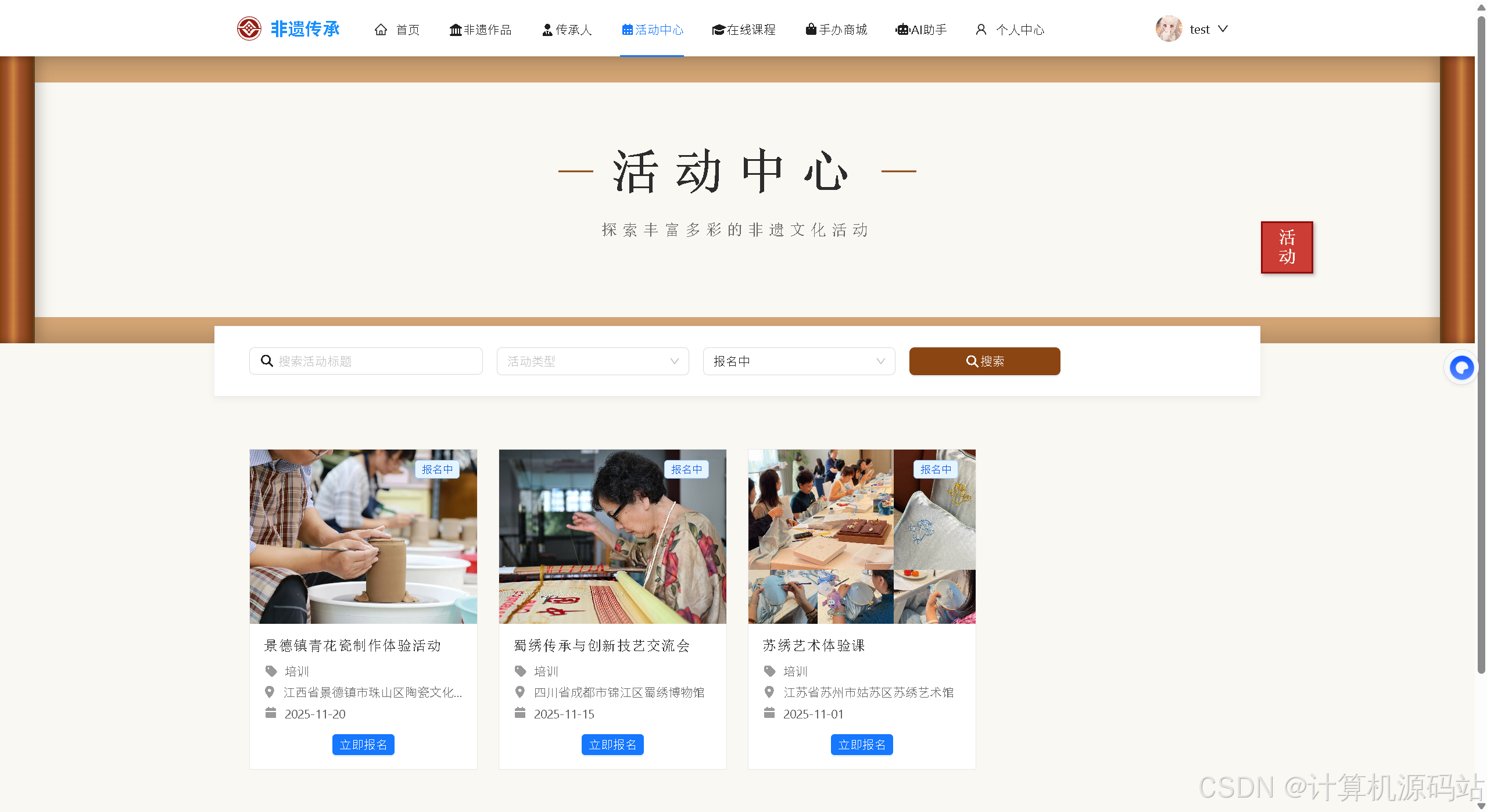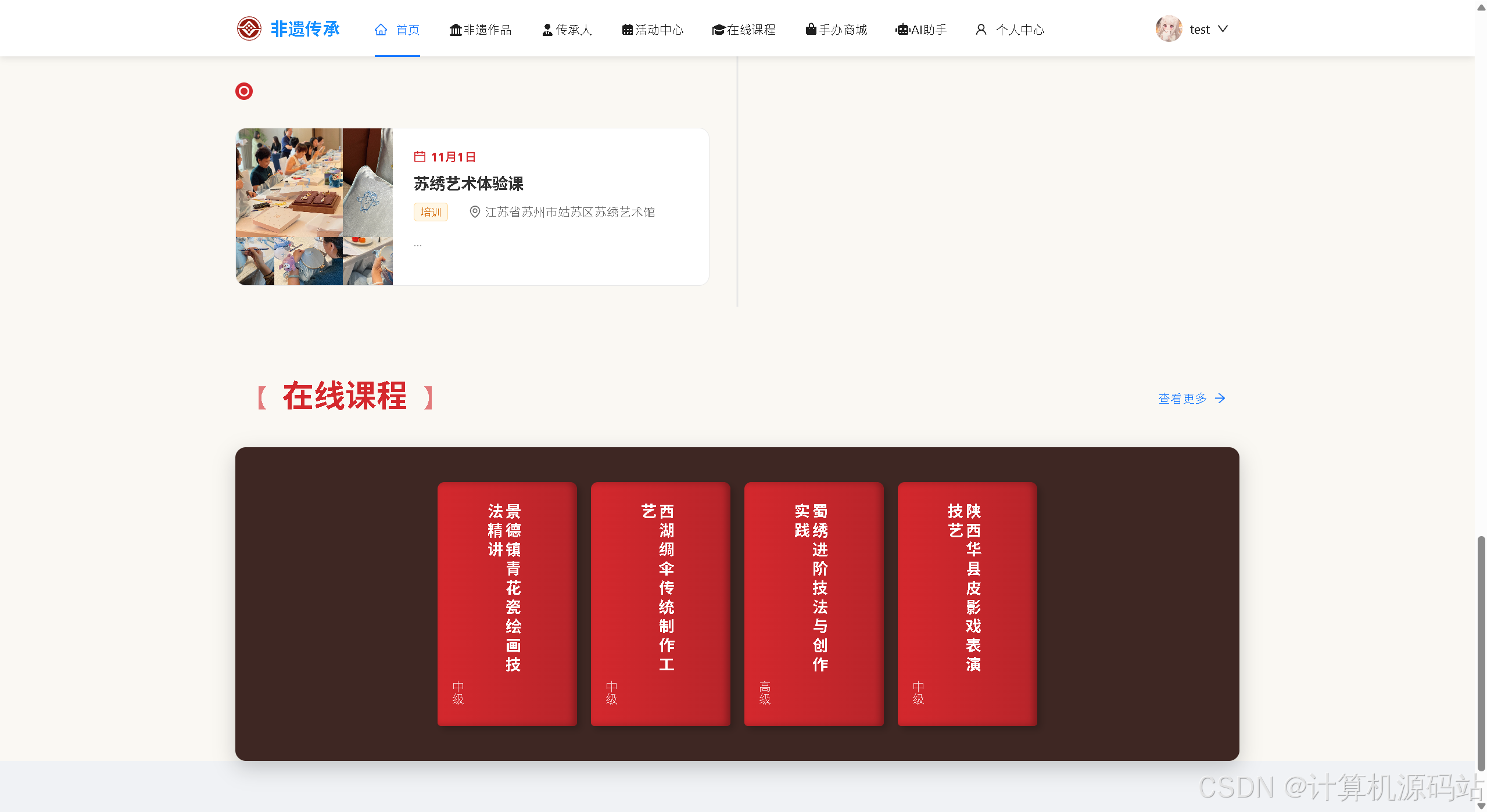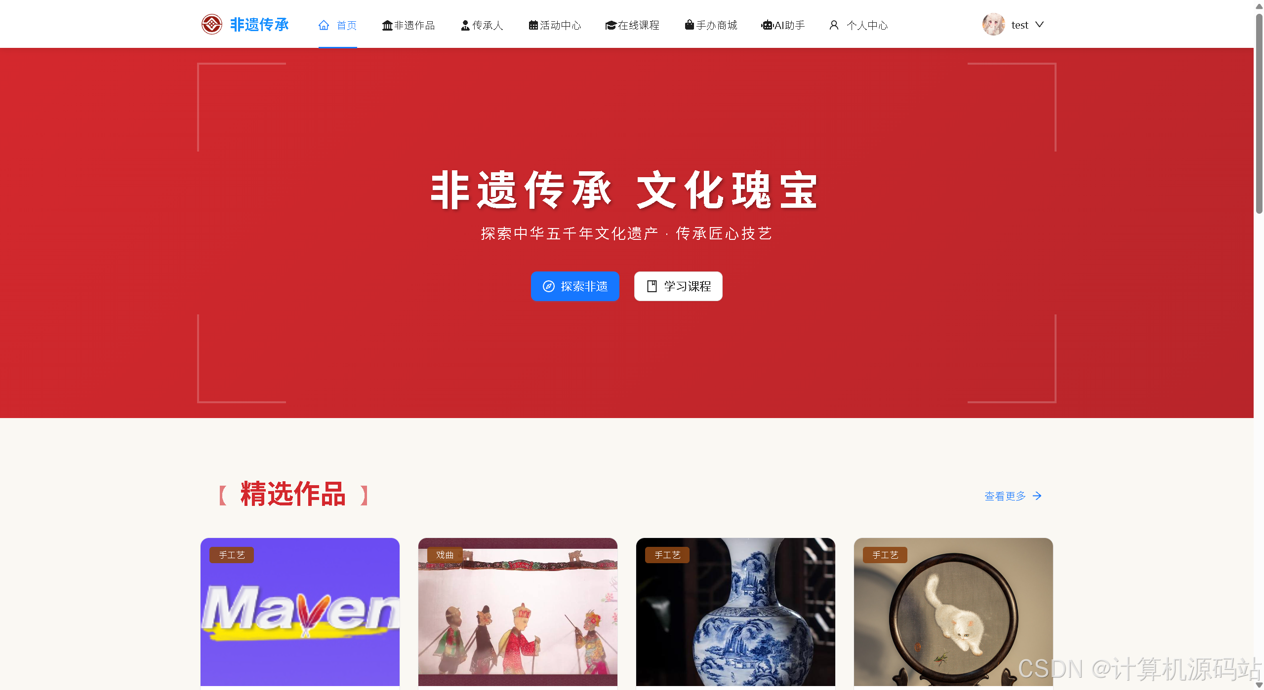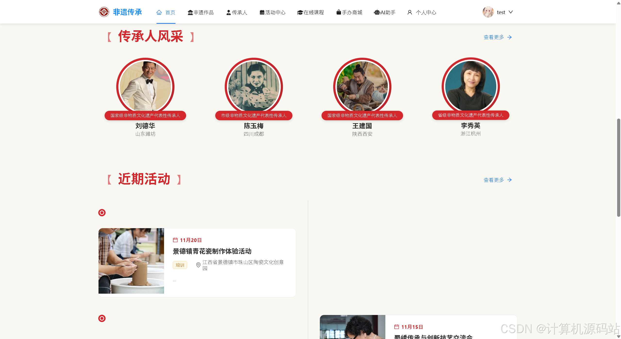 - 登录、注册、热门作品查询、作品搜索、最新作品查询、活动报名、非遗课程学习、传承人查询