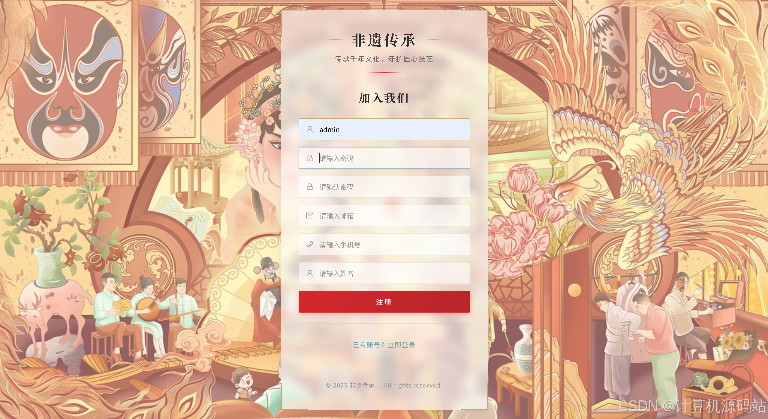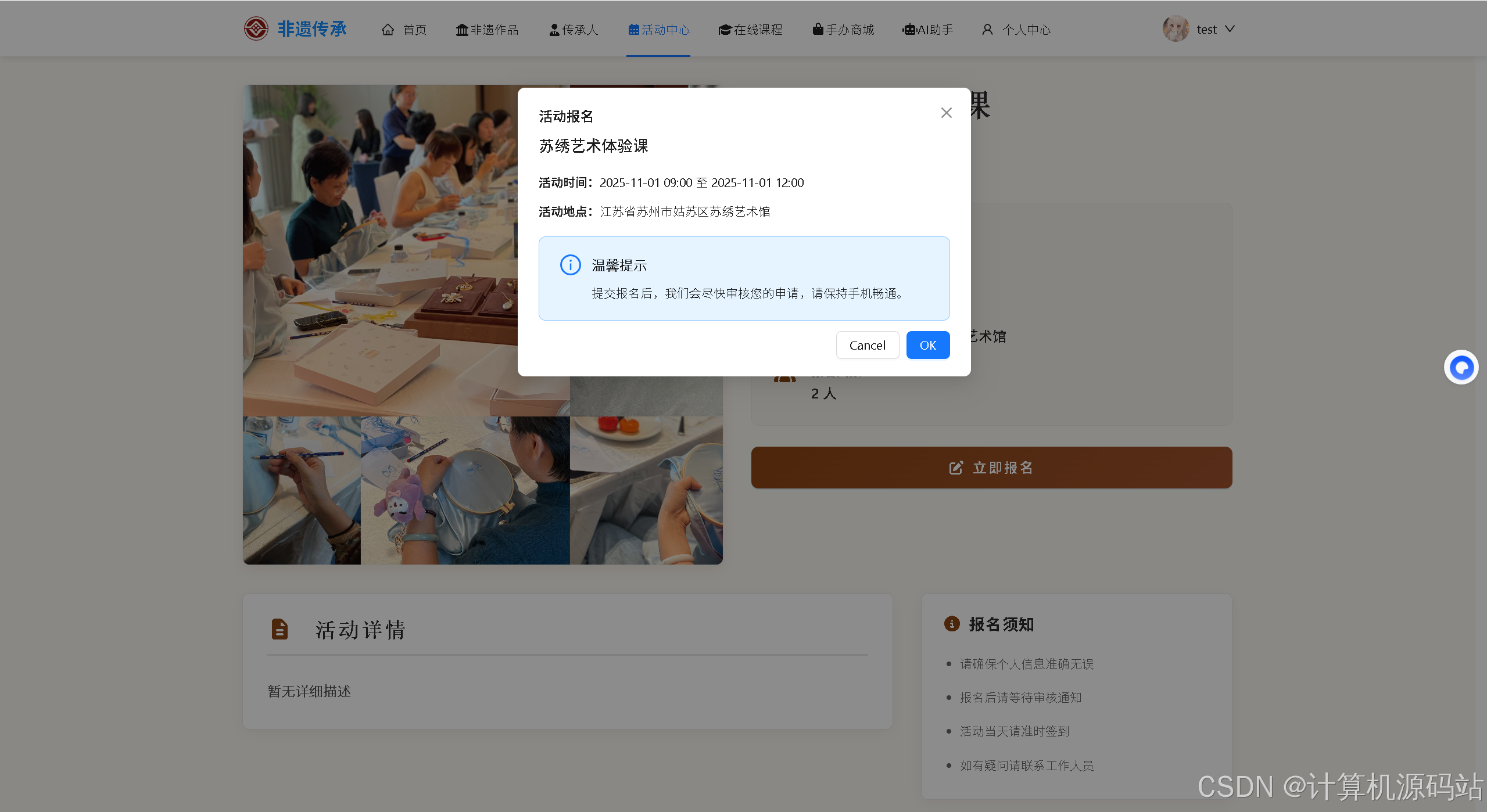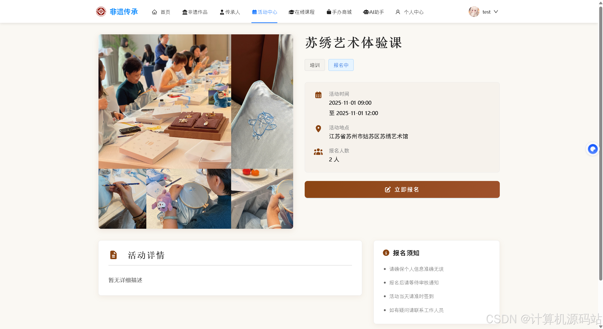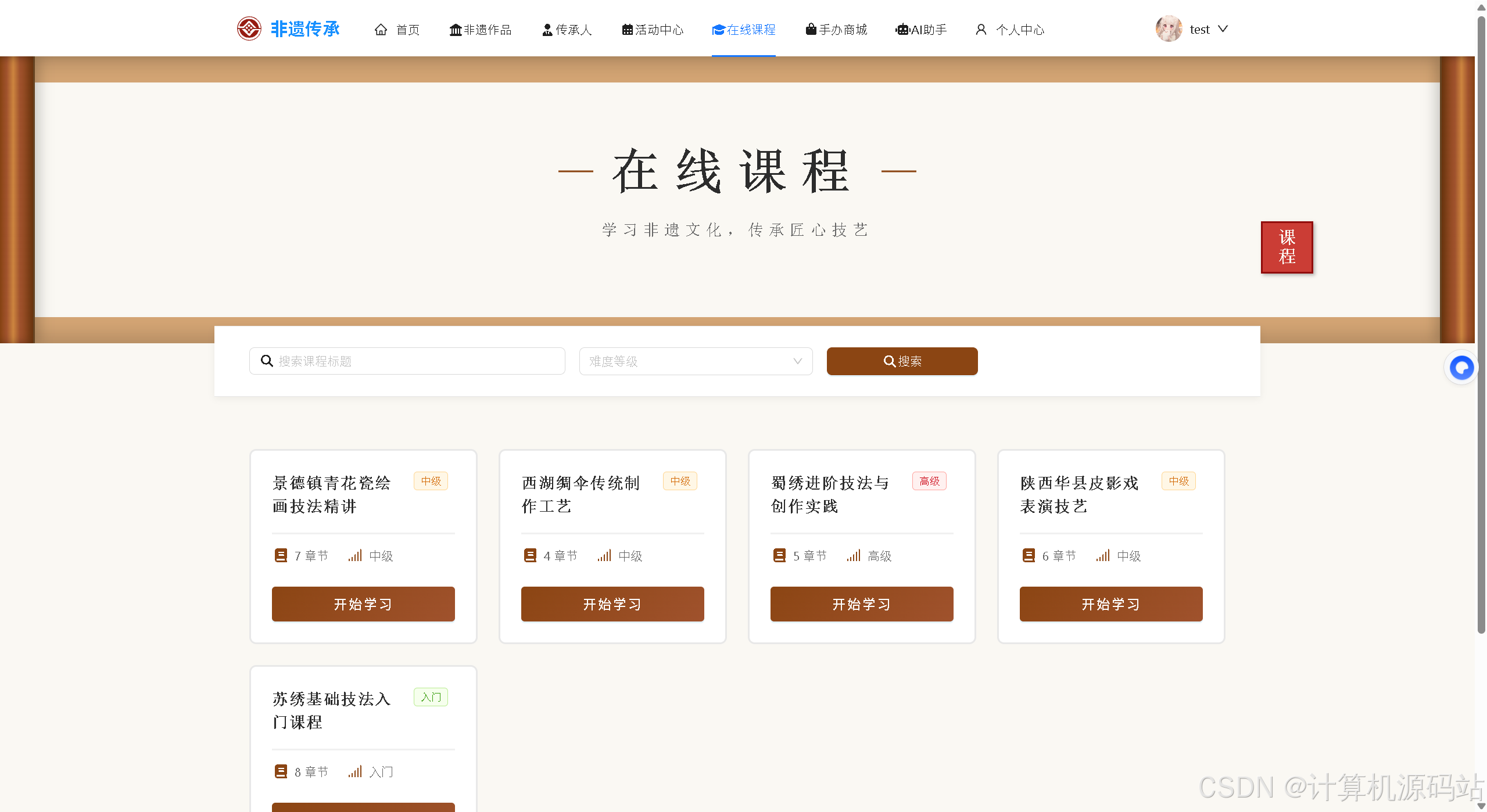 - 登录、注册、热门作品查询、作品搜索、最新作品查询、活动报名、非遗课程学习、传承人查询