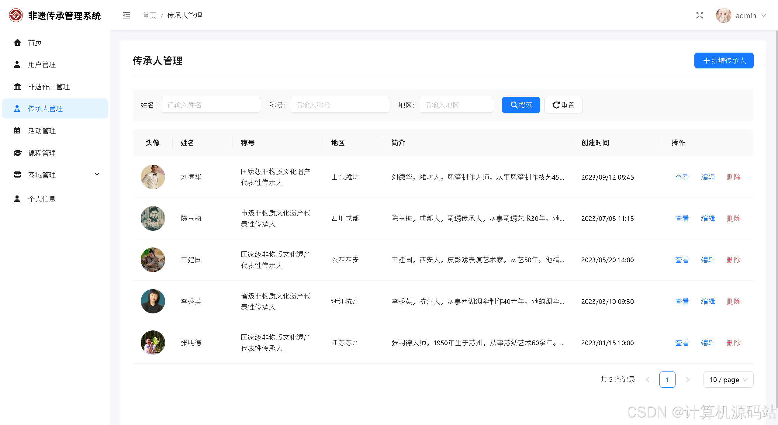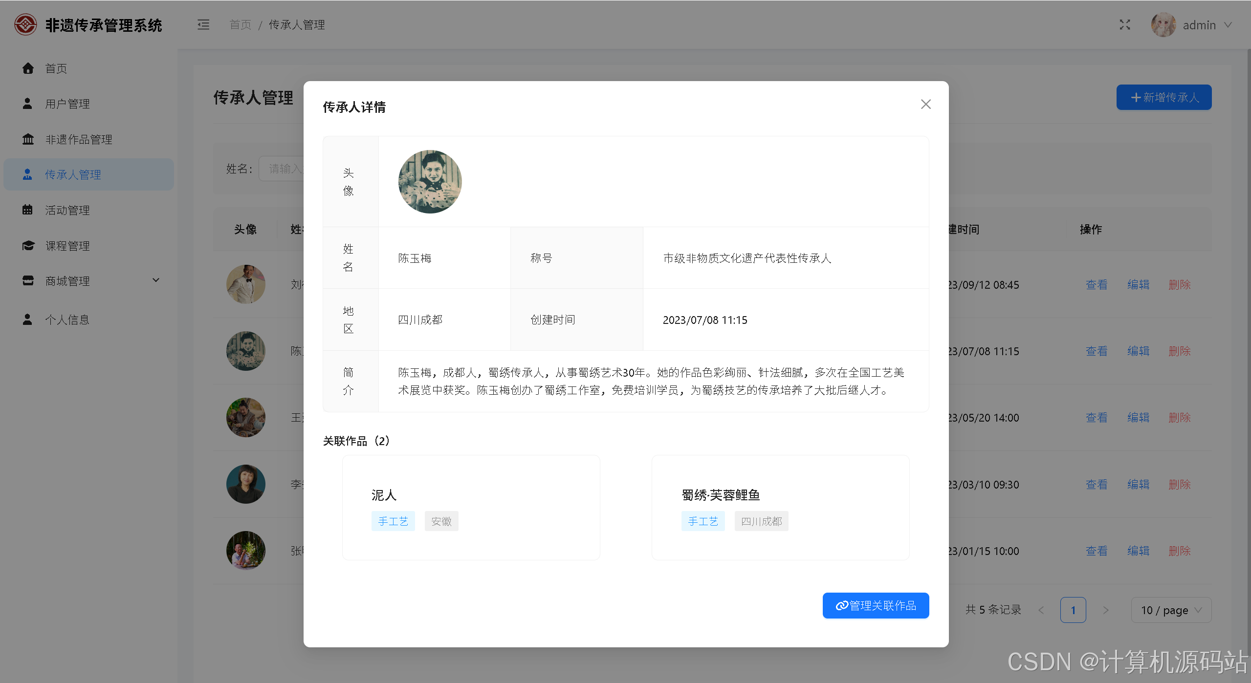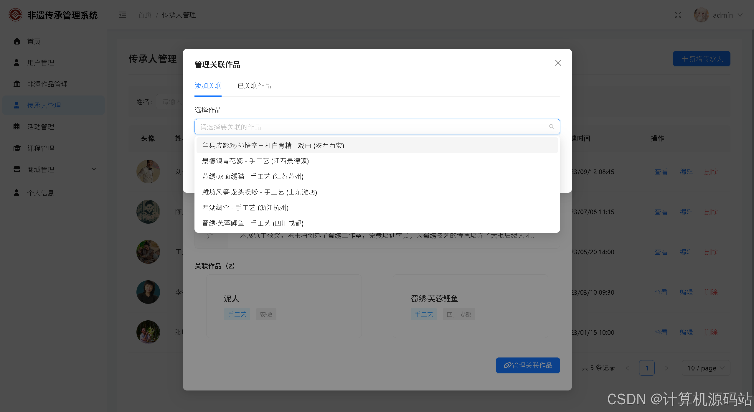 - 传承人管理:传承人增删改查、传承人与作品关联管理