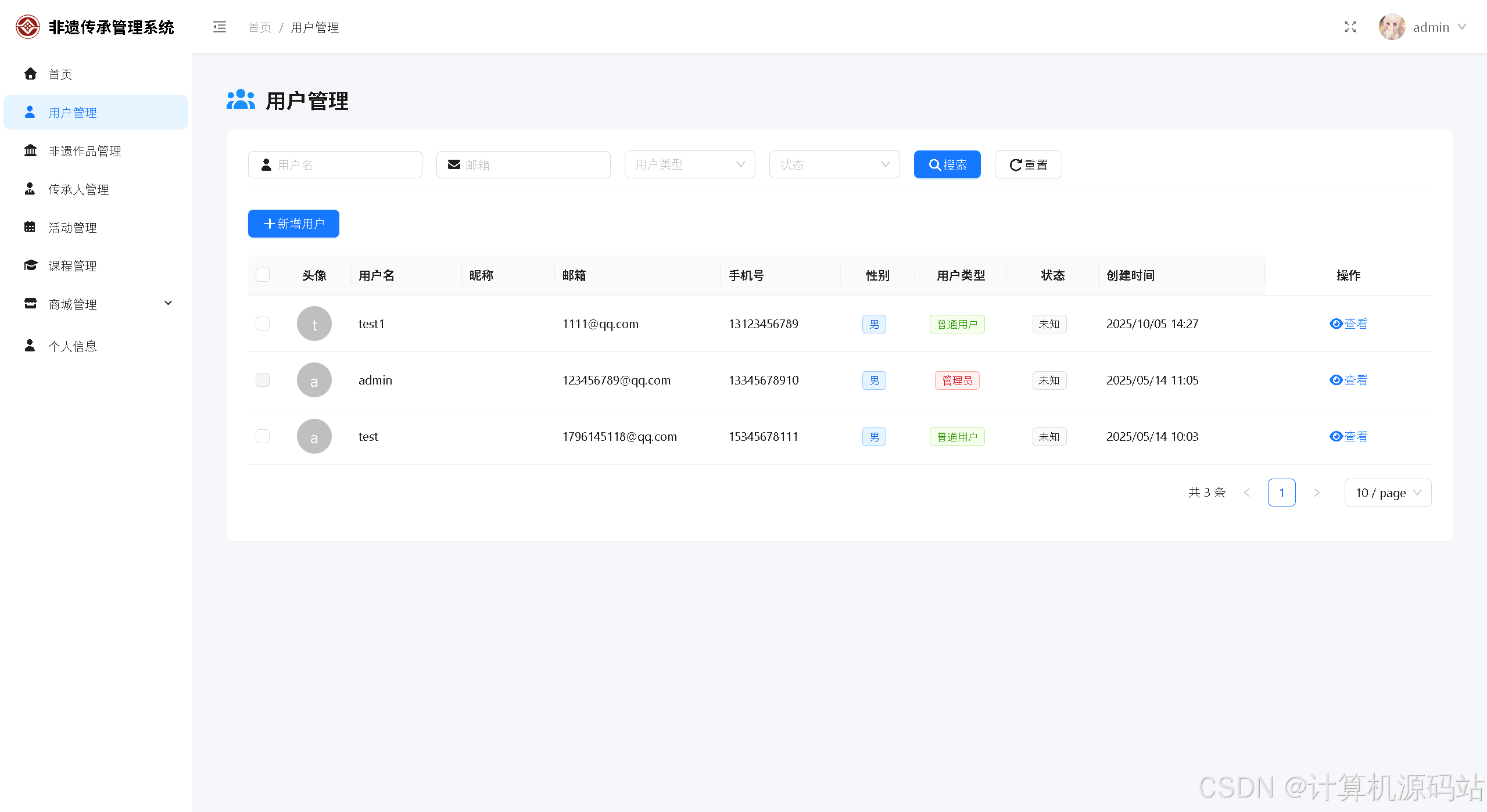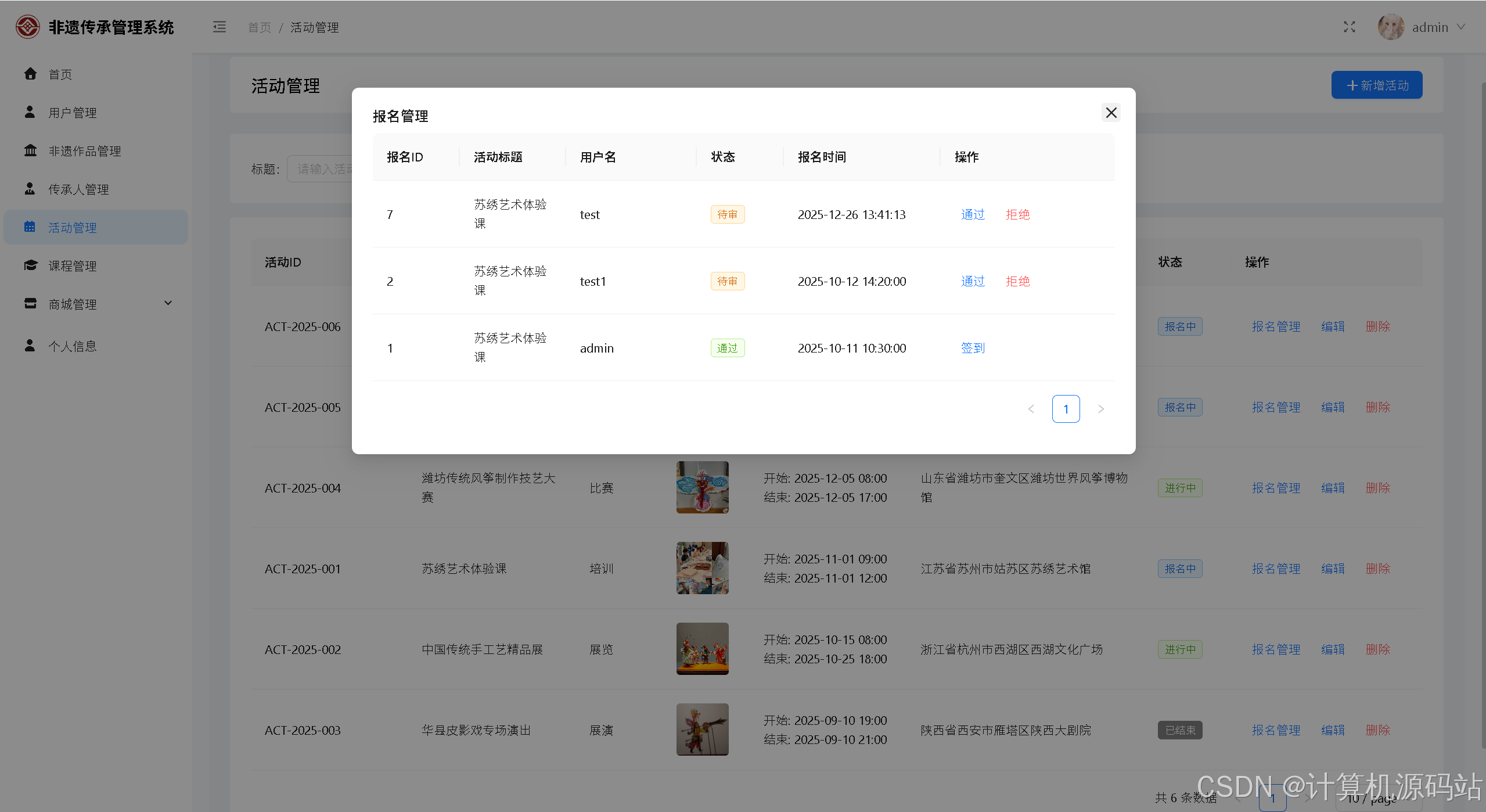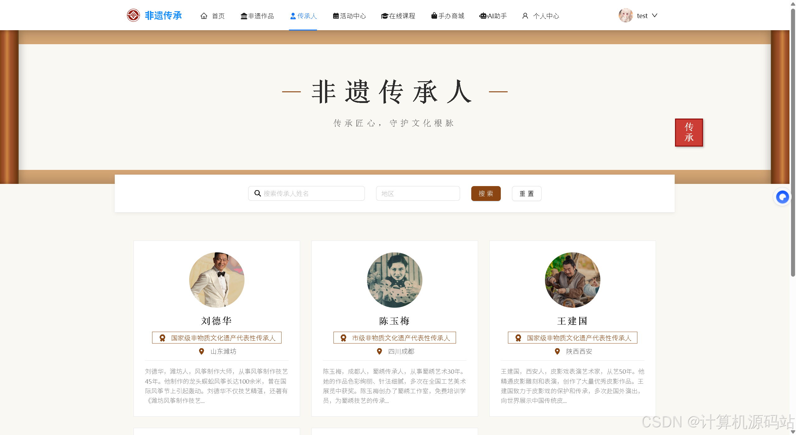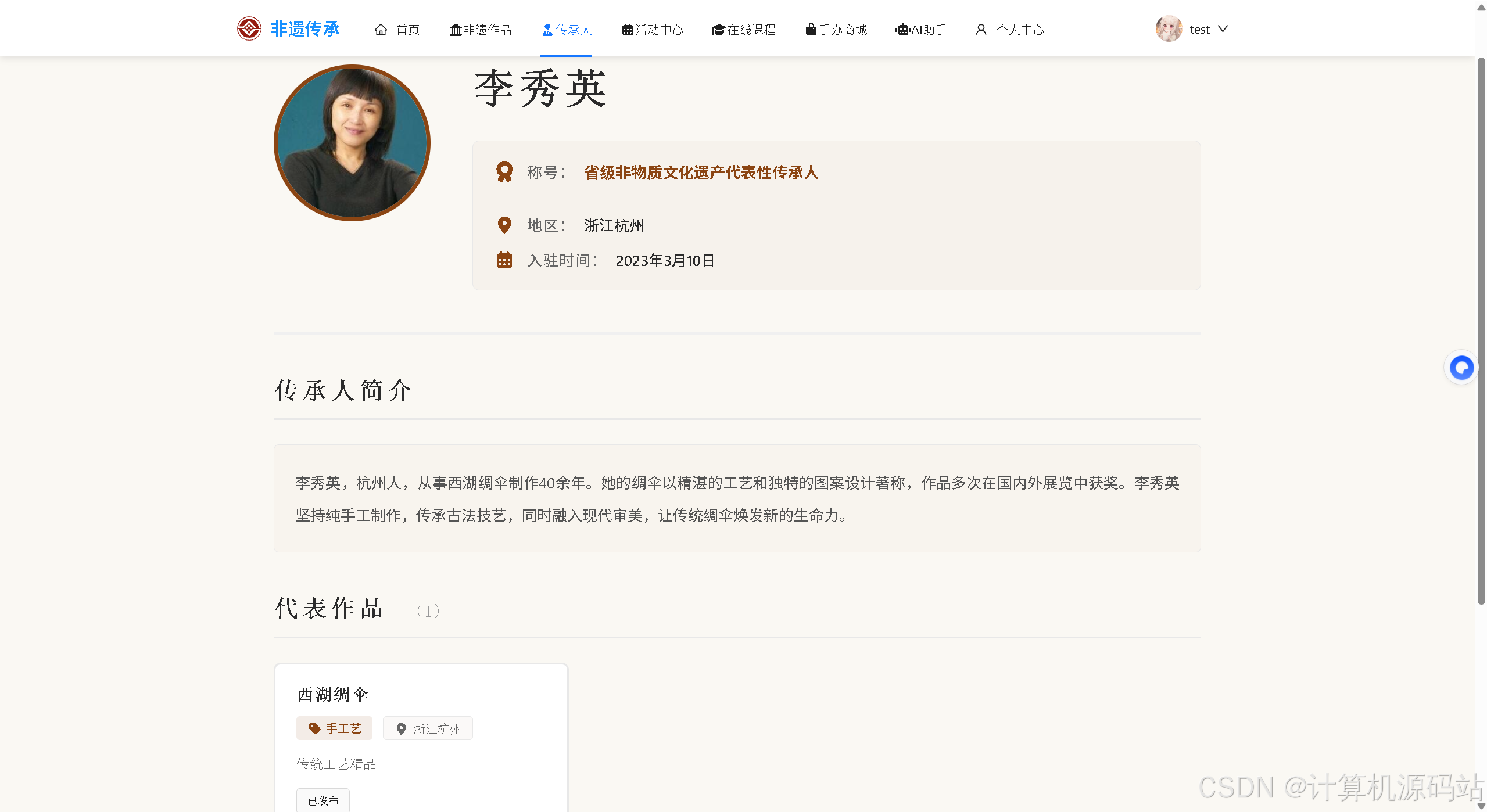 - 传承人管理:传承人增删改查、传承人与作品关联管理