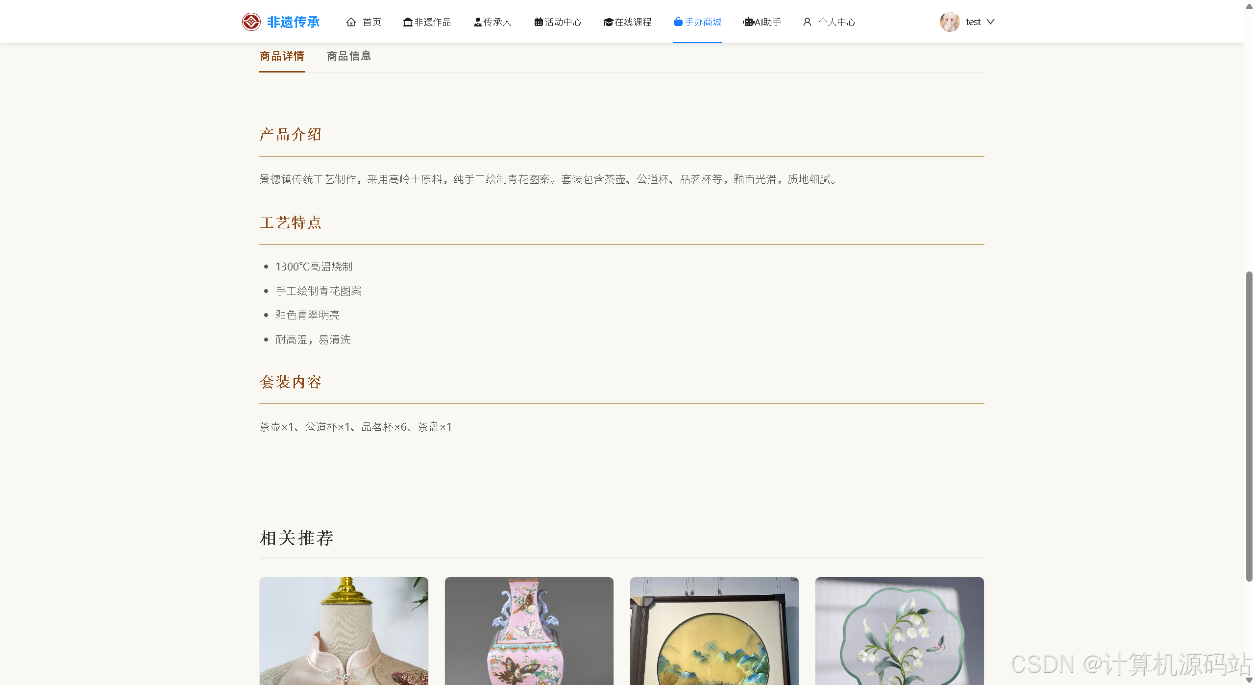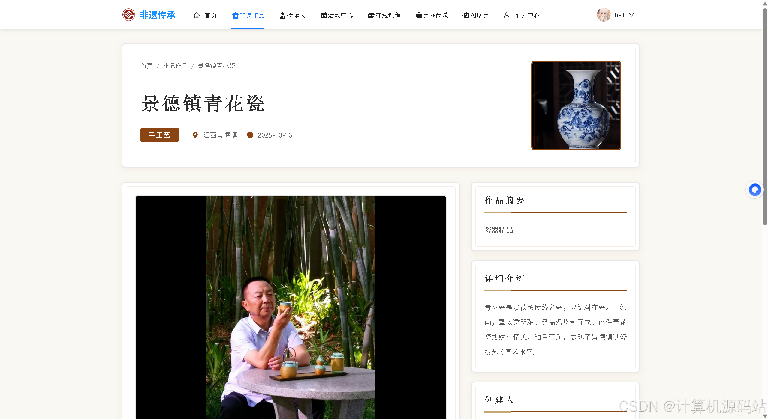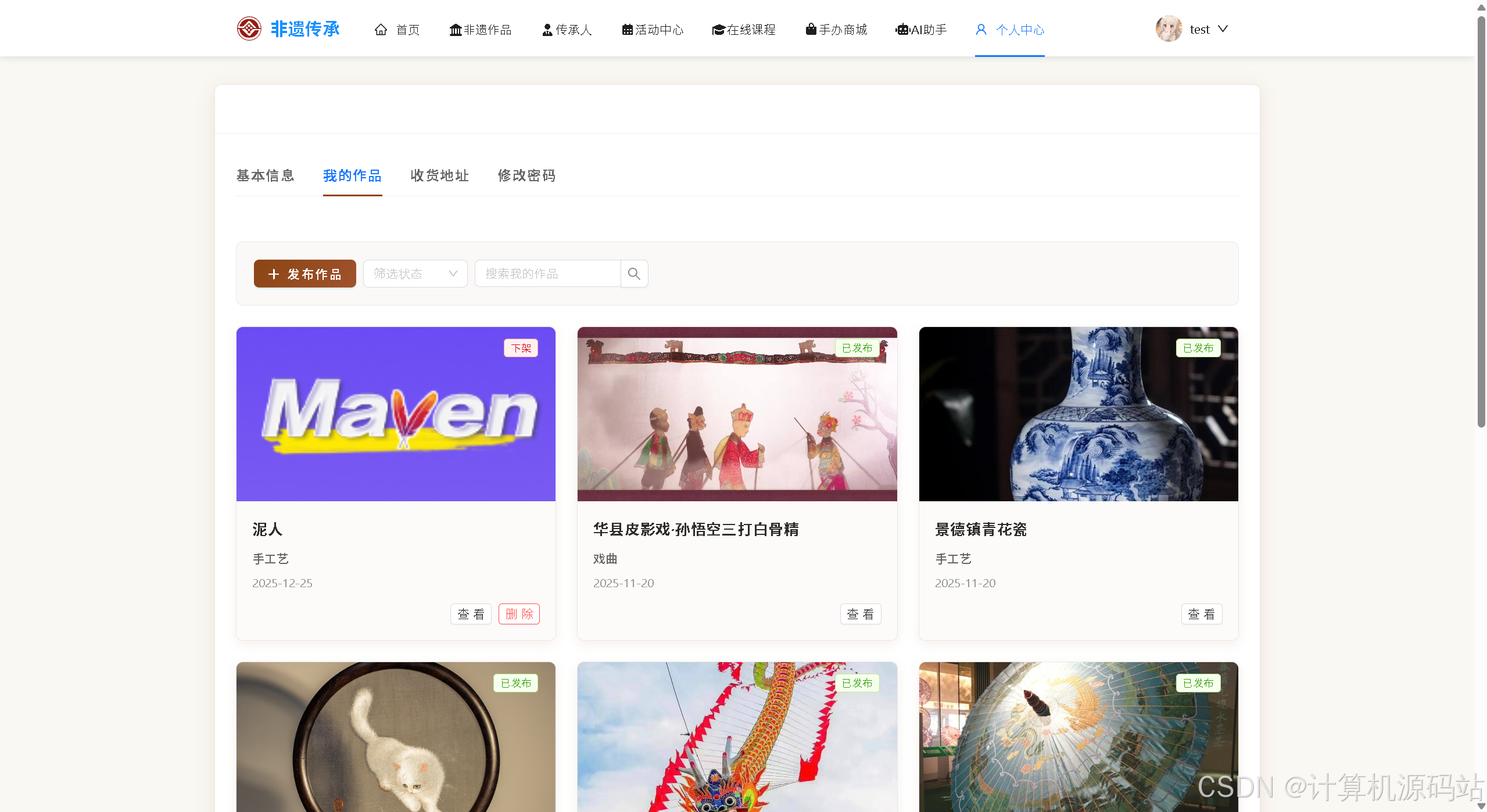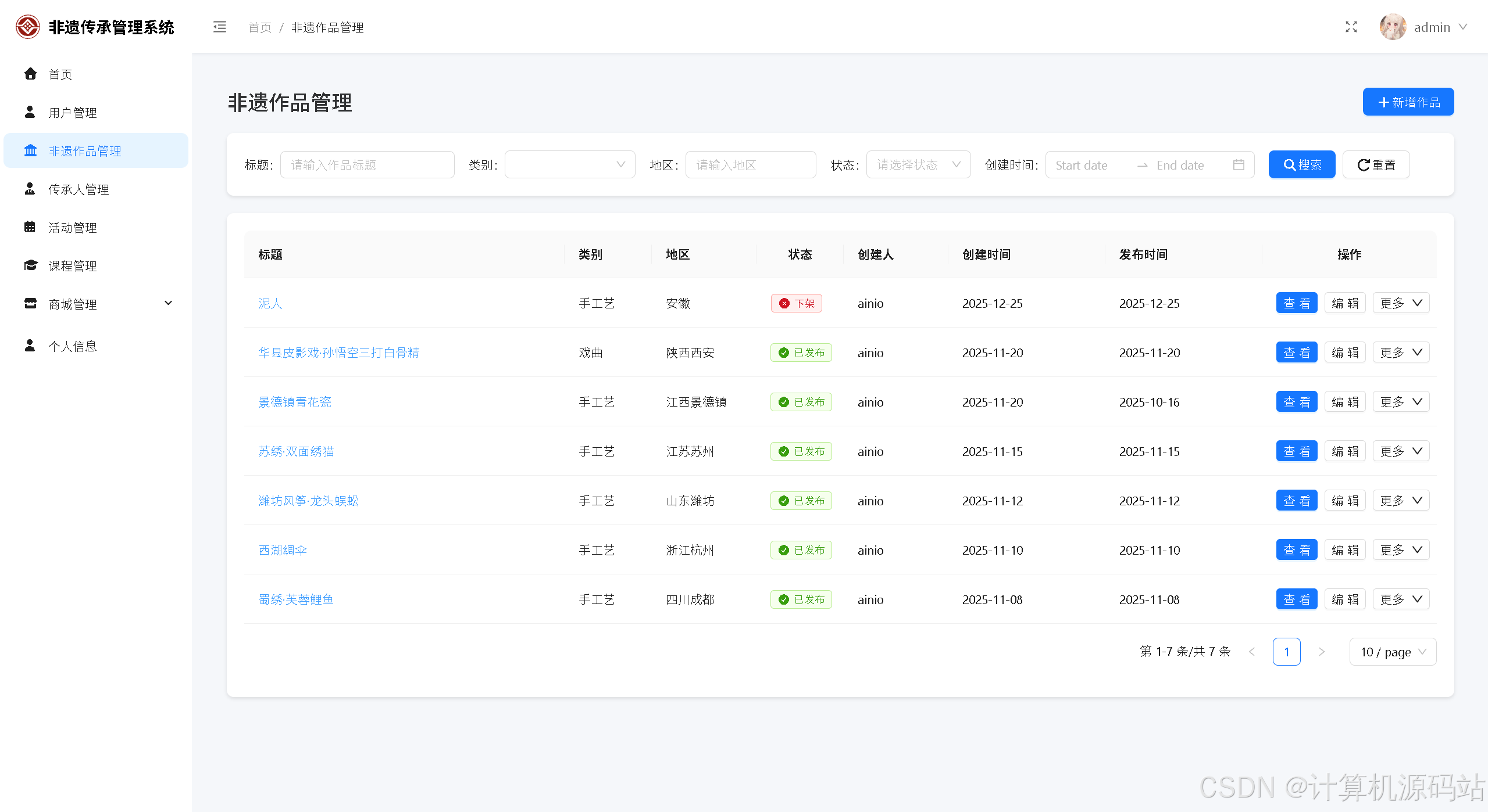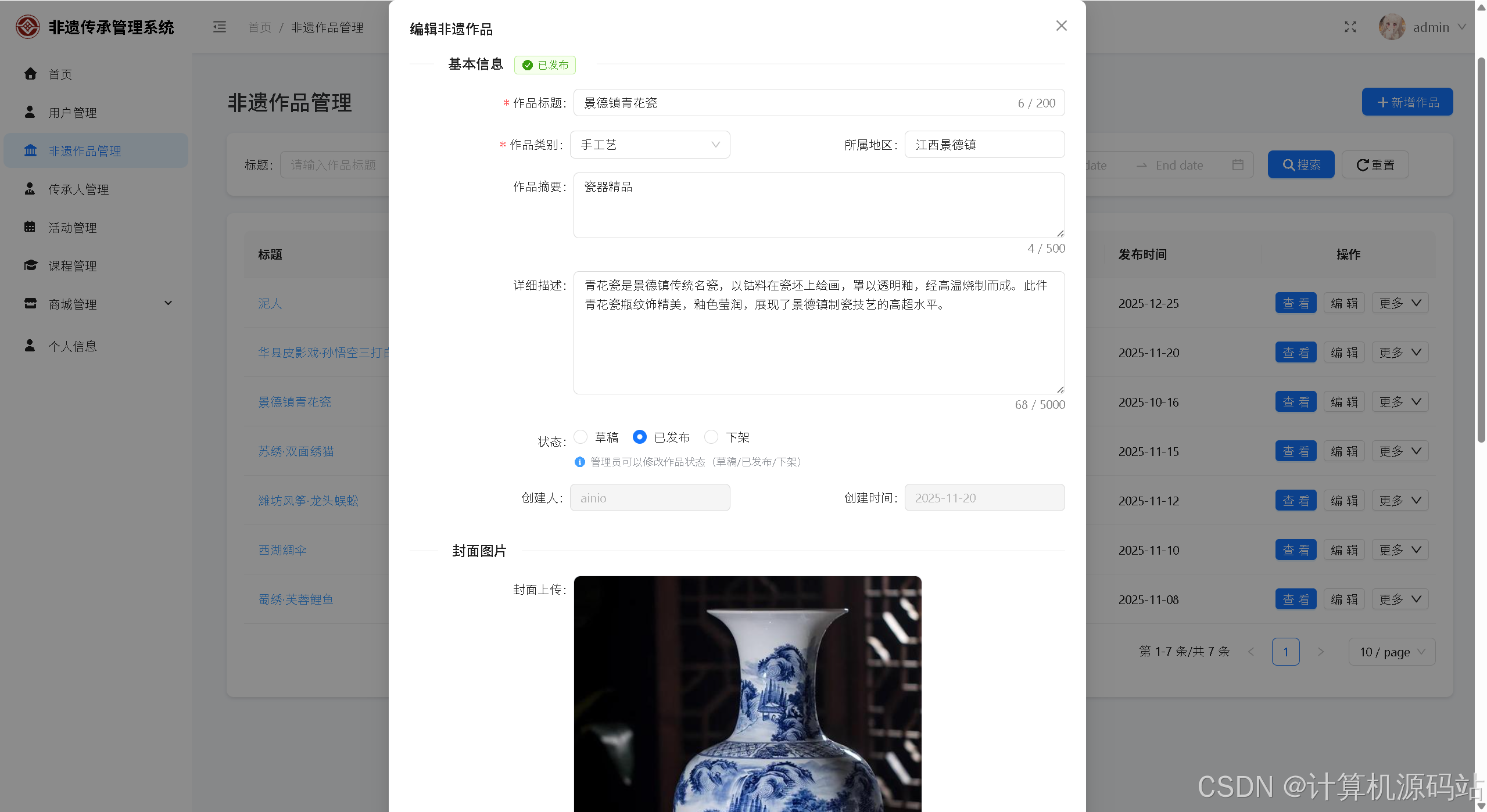 - 非遗作品管理:非遗作品增删改查、作品发布、作品下架