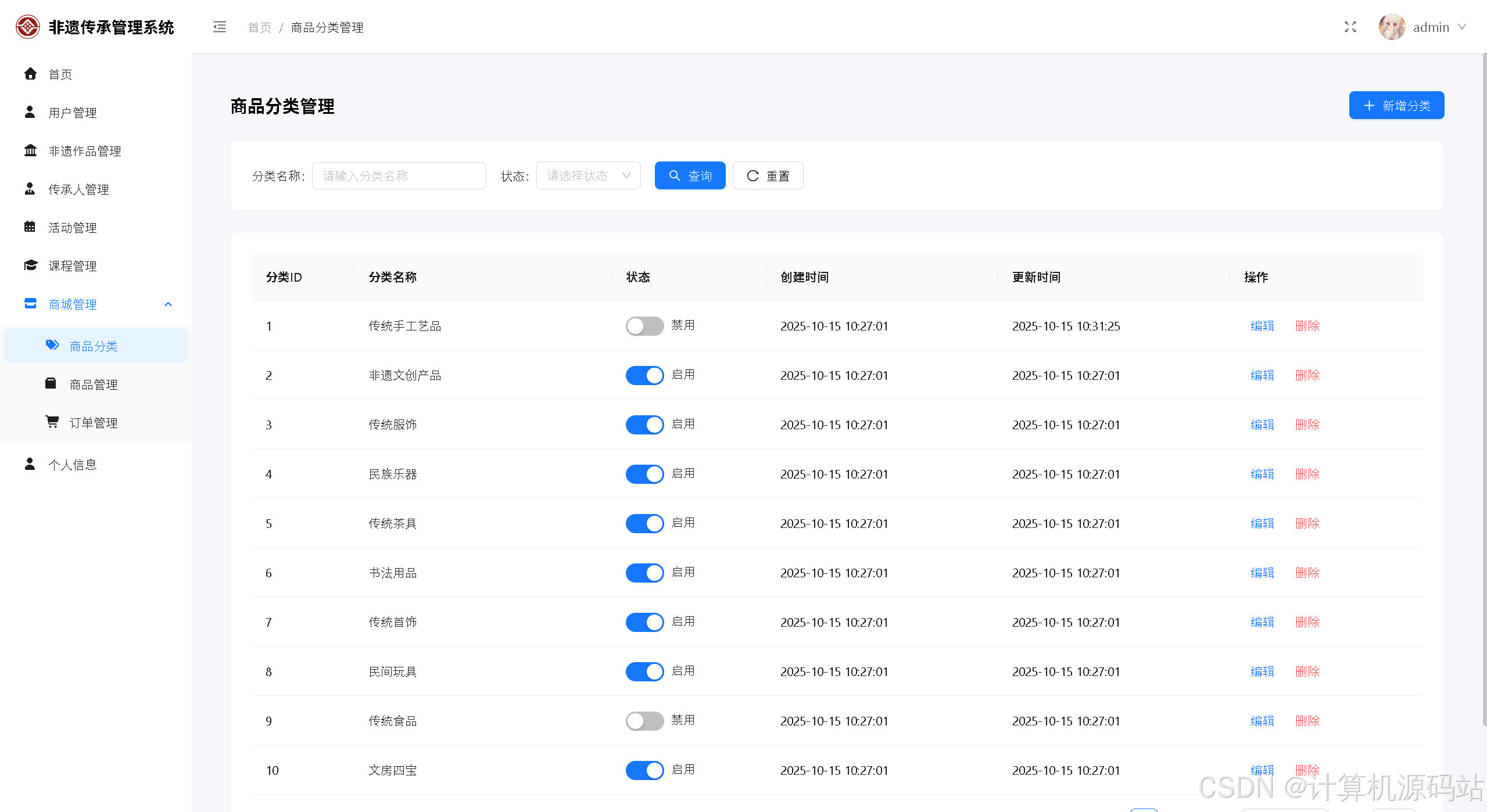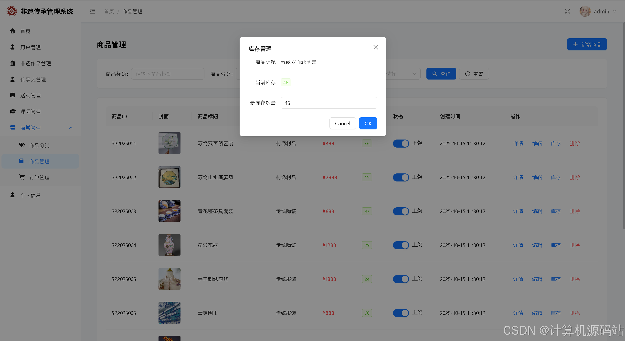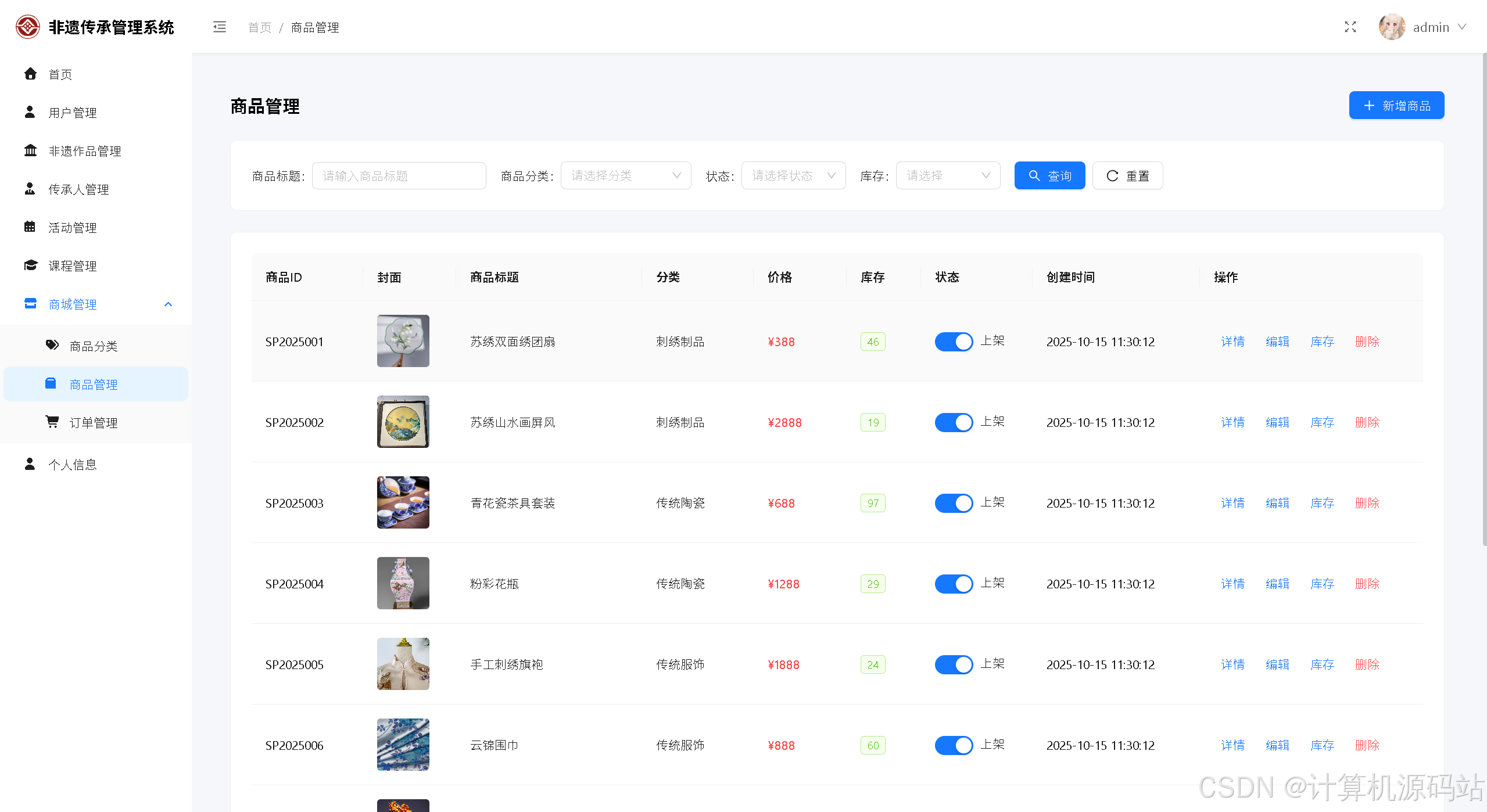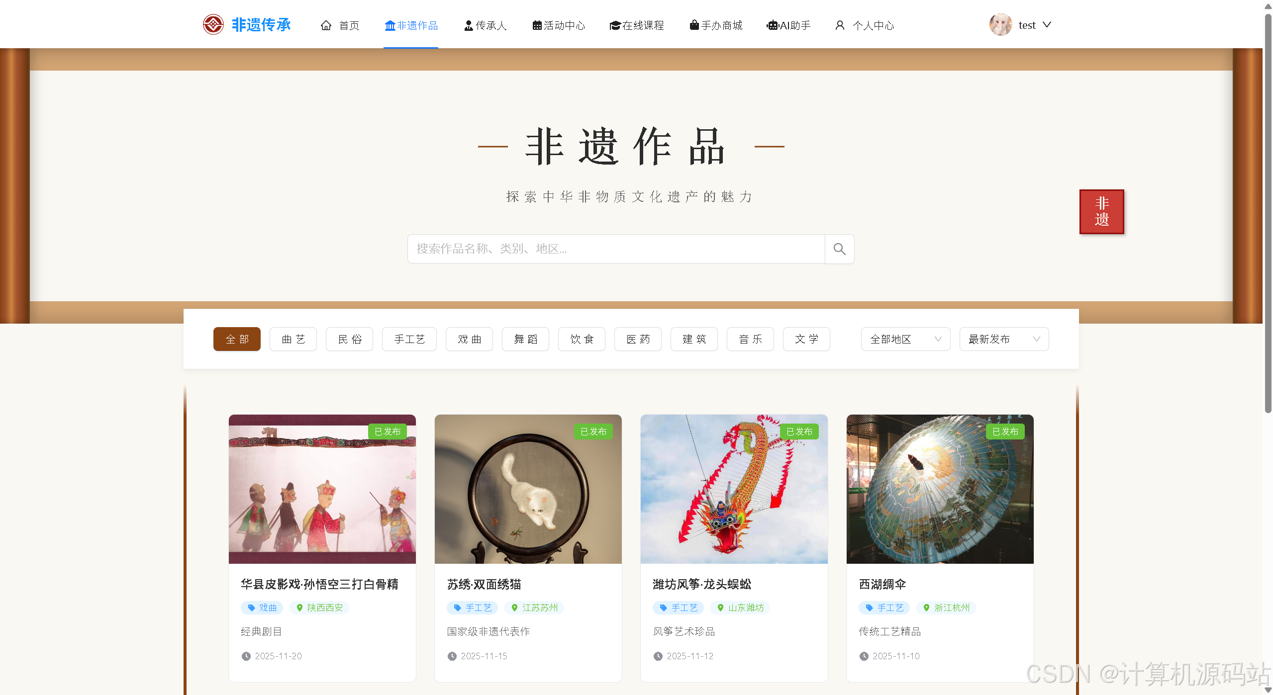 - 非遗作品管理:非遗作品增删改查、作品发布、作品下架