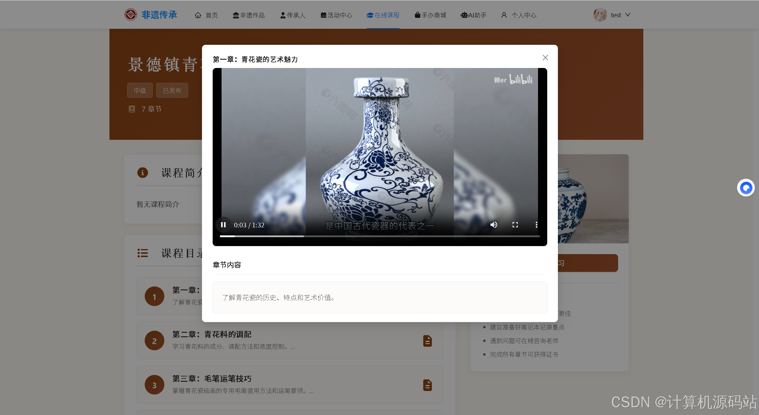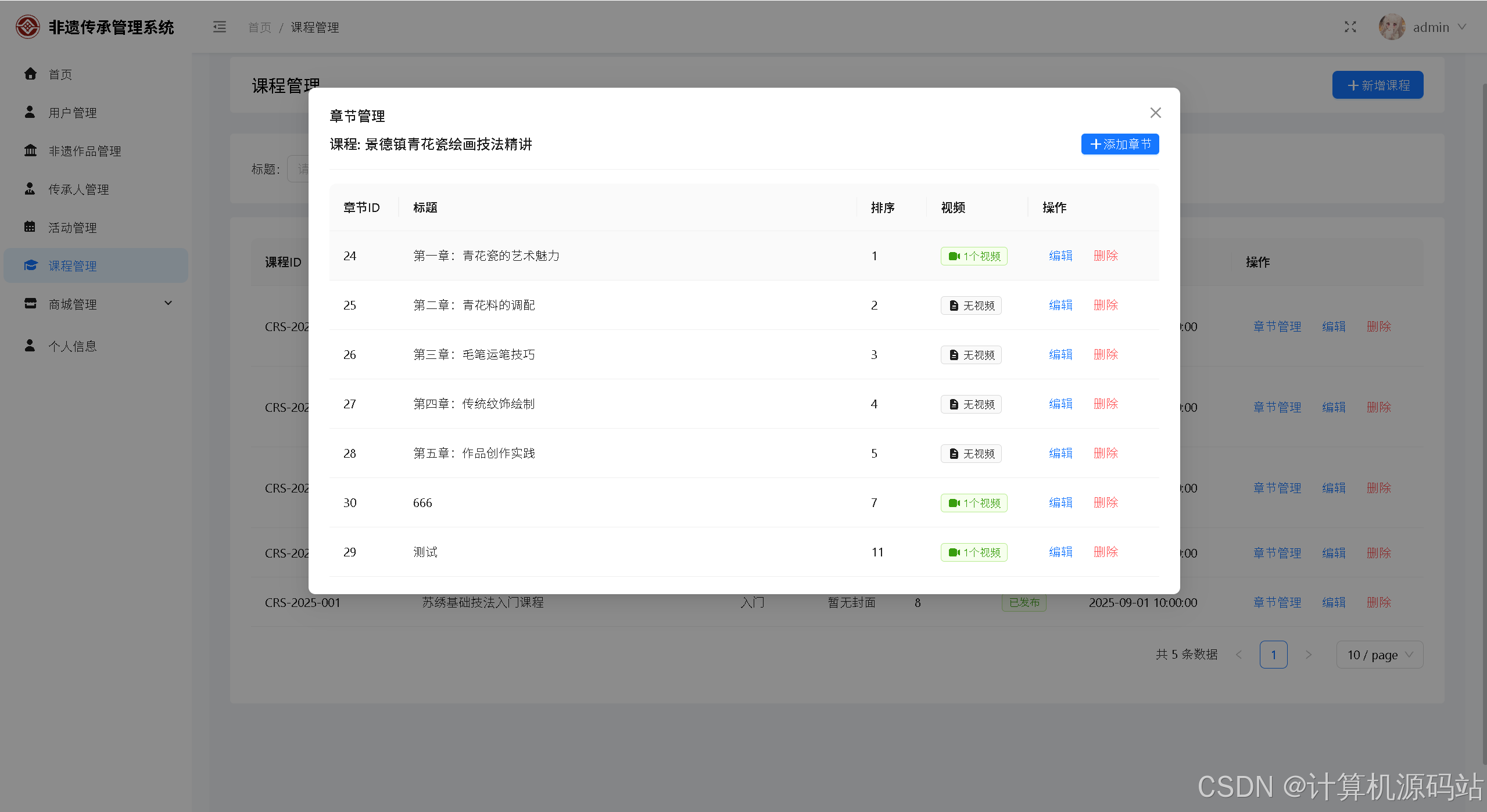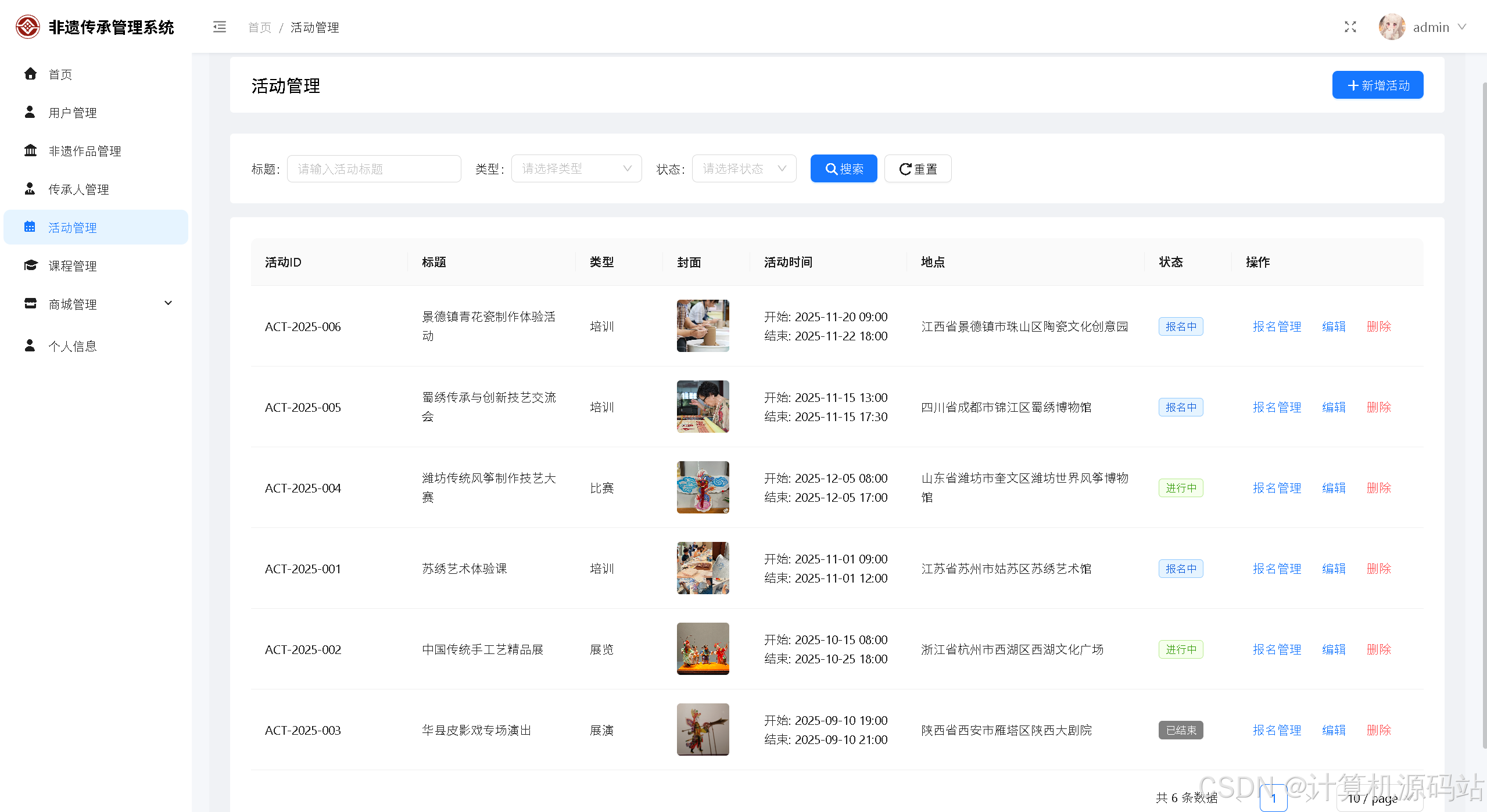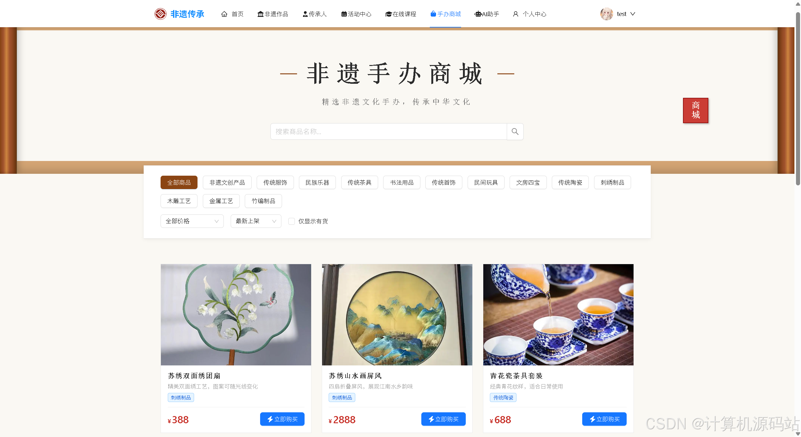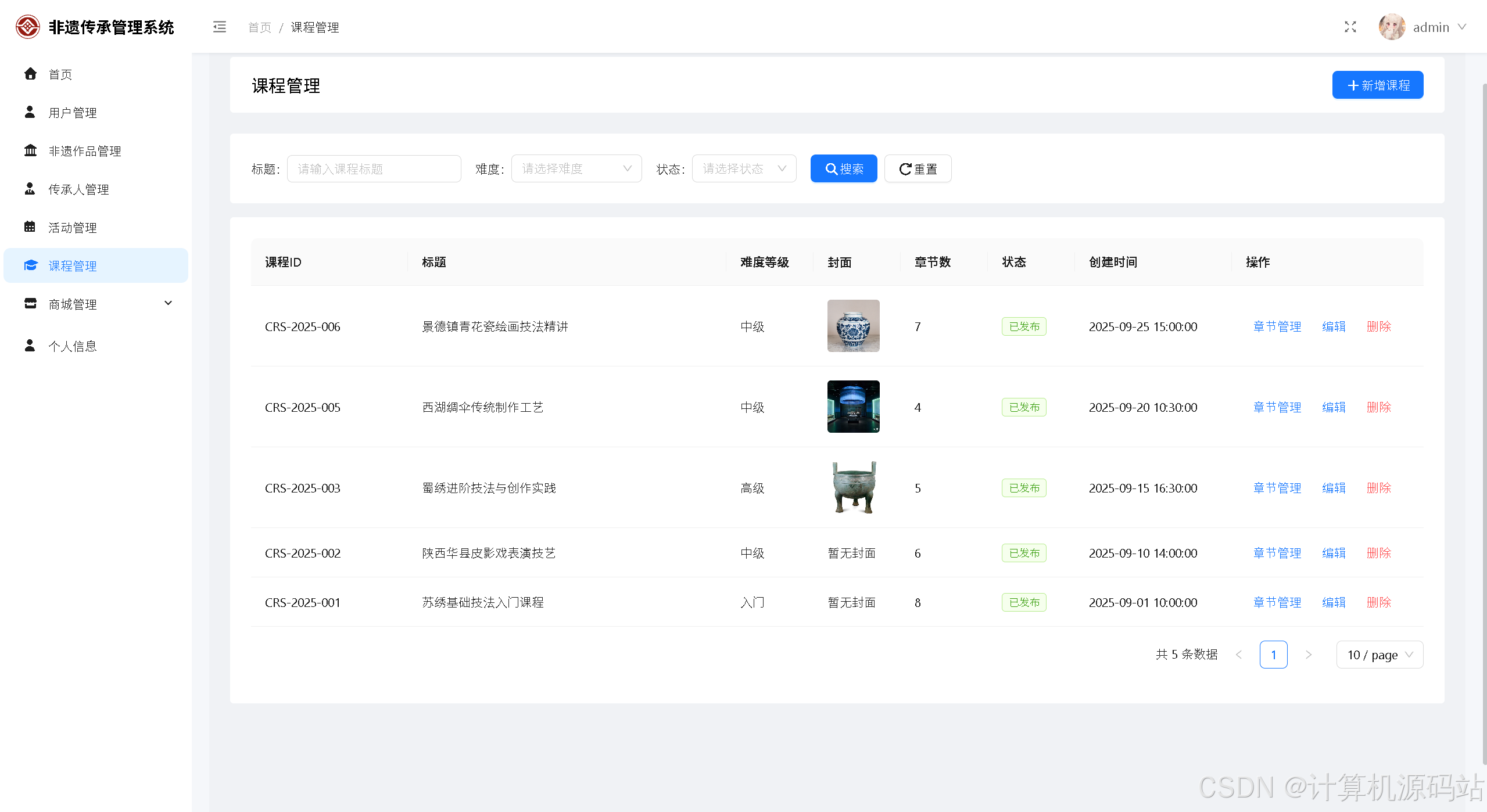 - 非遗作品管理:非遗作品增删改查、作品发布、作品下架