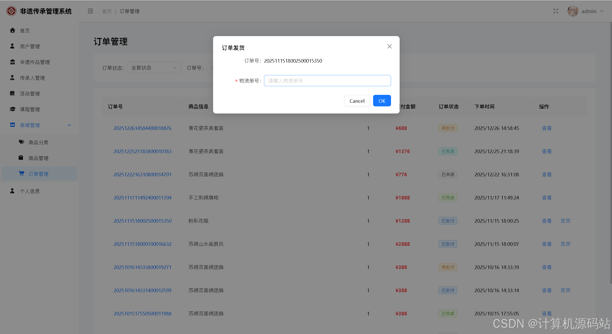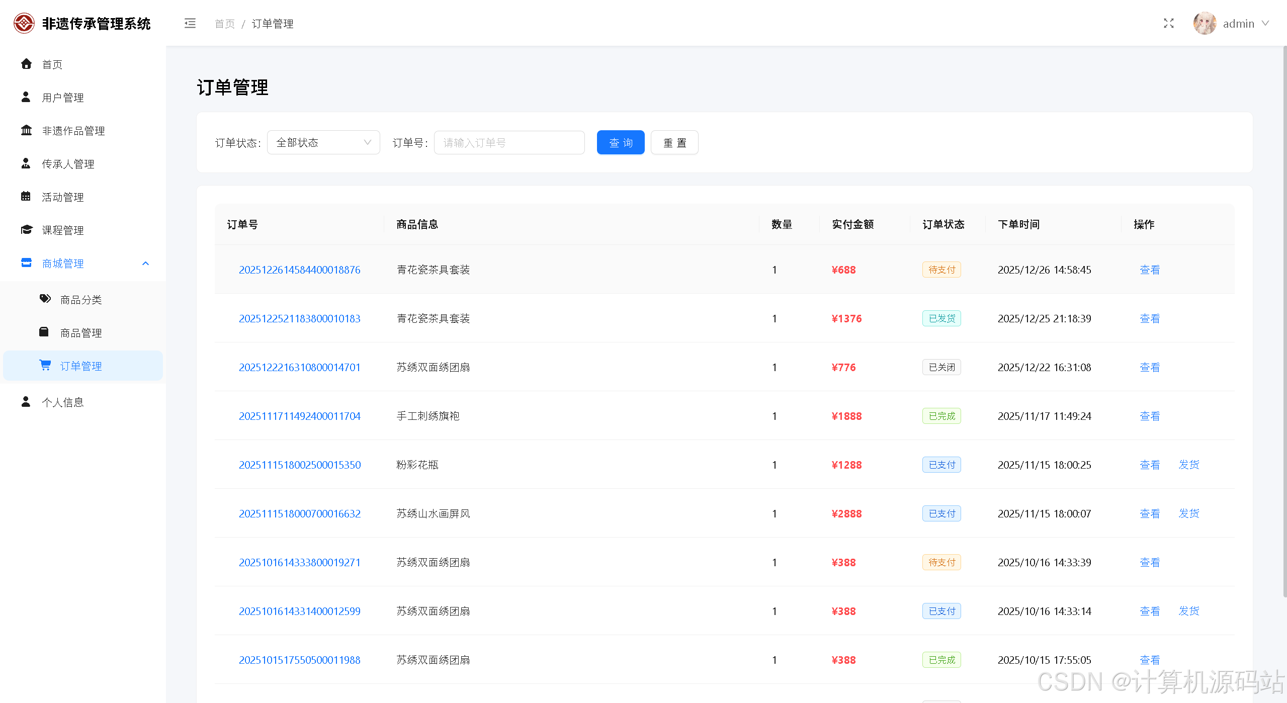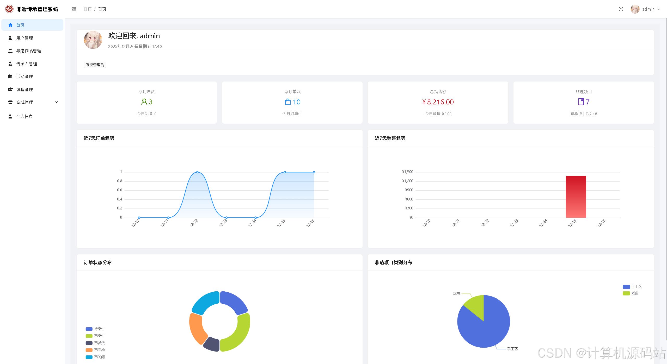 - 首页大屏数据图表统计:用户数、订单数、销售额、非遗作品数、订单趋势曲线图、销售额柱状图、订单状态分布环状图、非遗类别饼状图