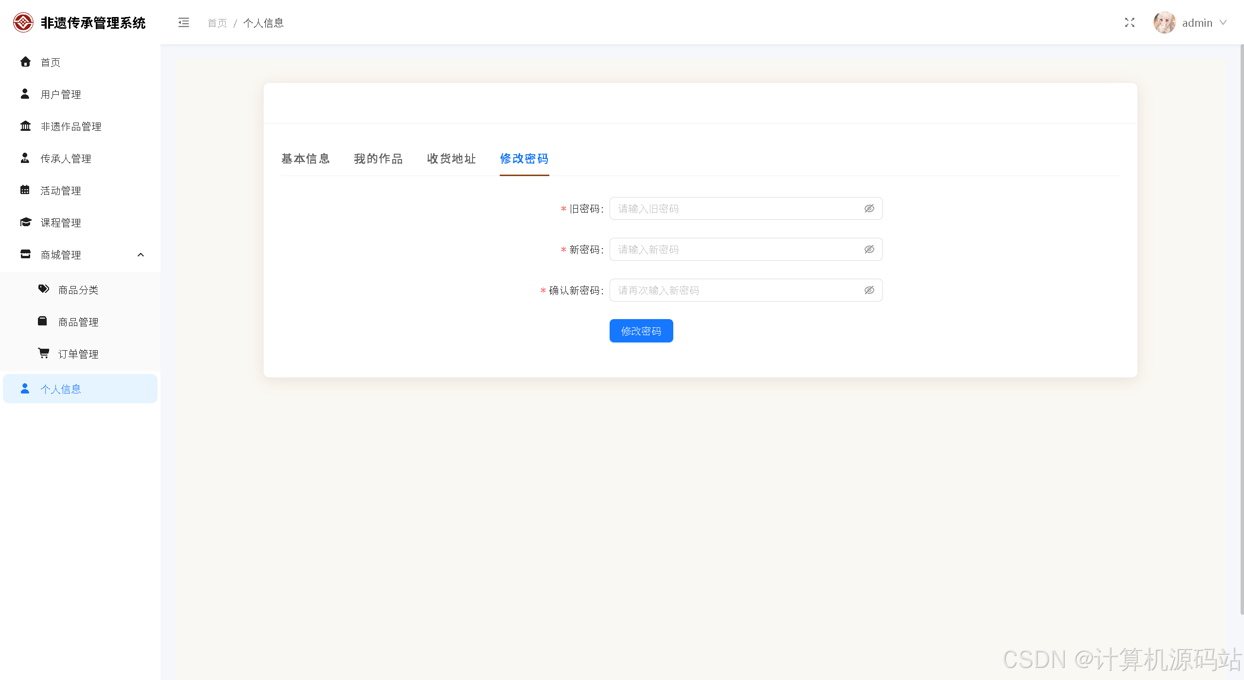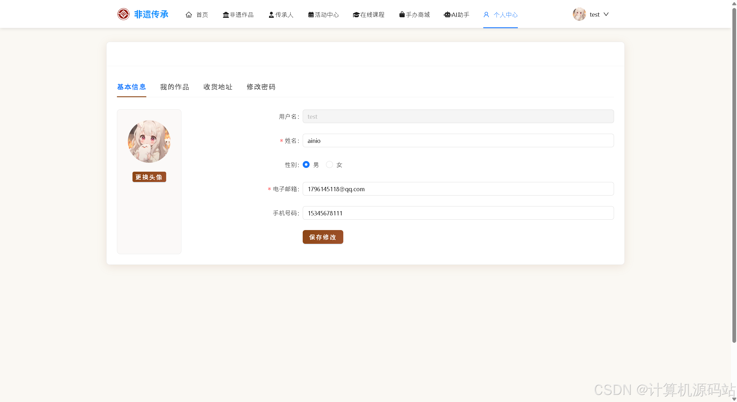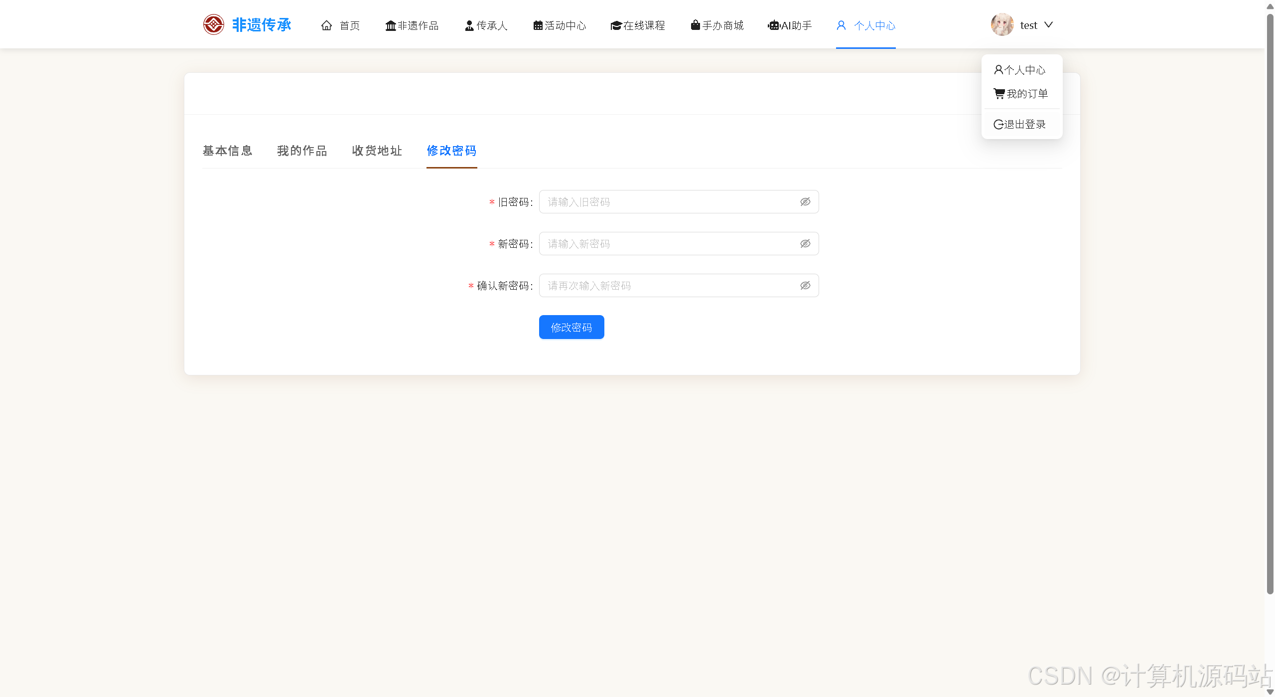 - 修改密码、个人信息修改、收货地址维护、默认地址设置、非遗作品发布