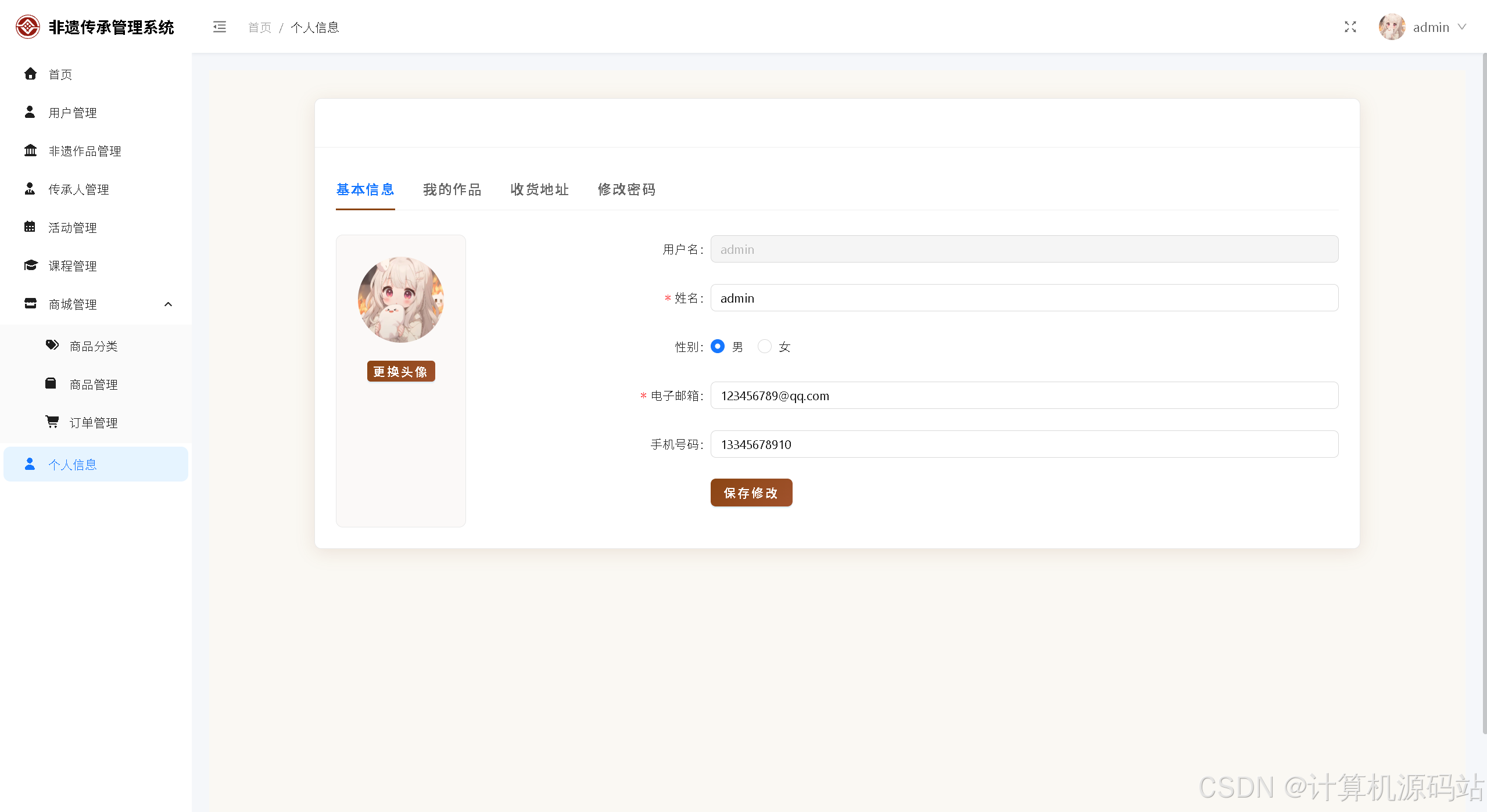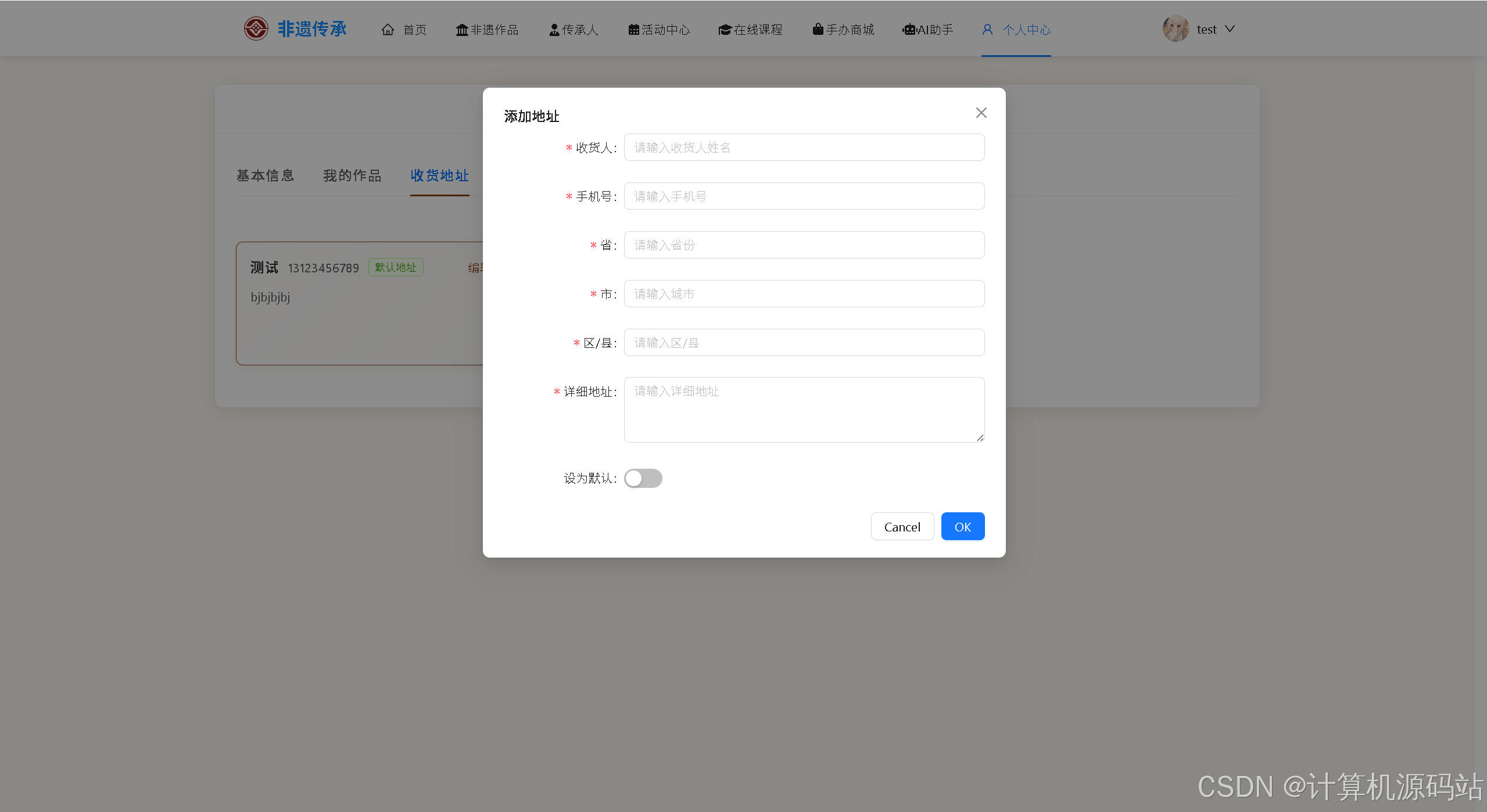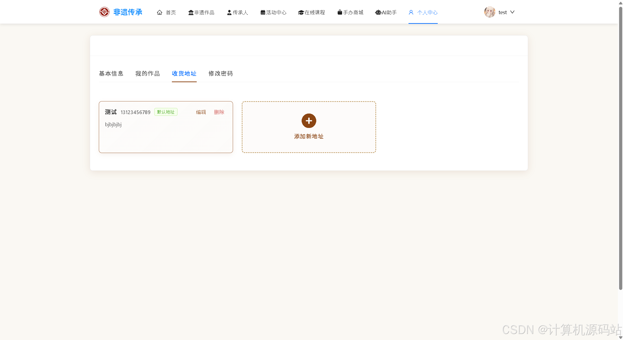 - 修改密码、个人信息修改、收货地址维护、默认地址设置、非遗作品发布