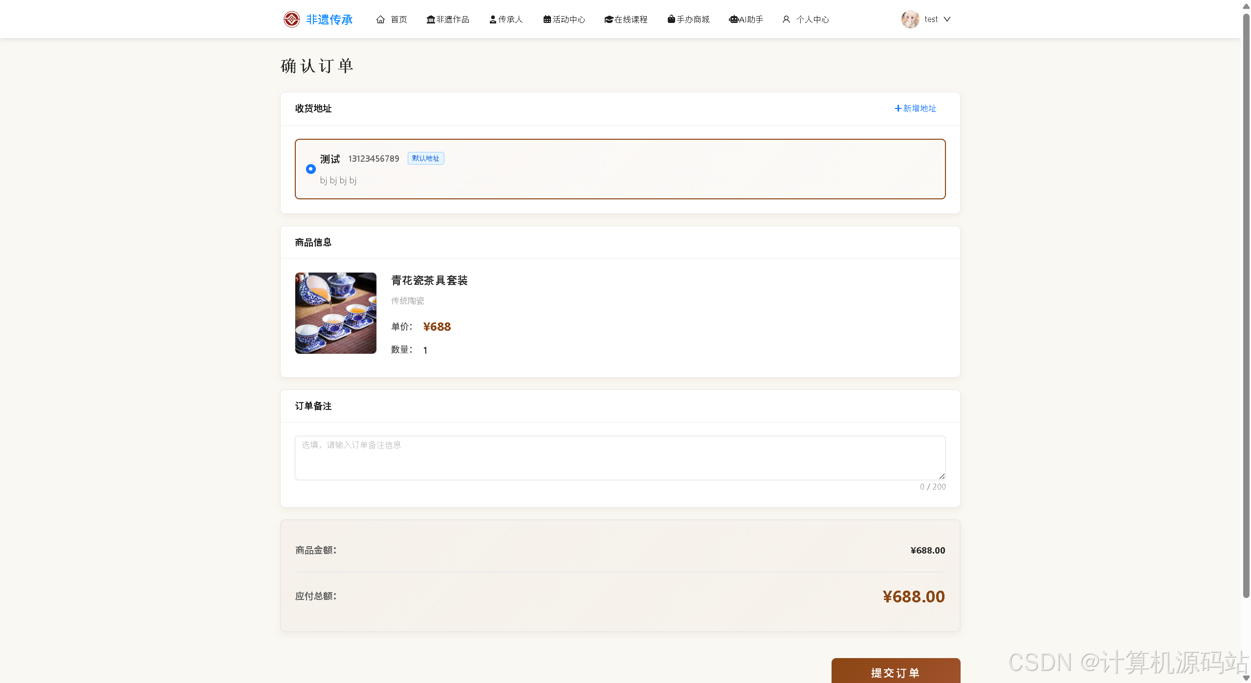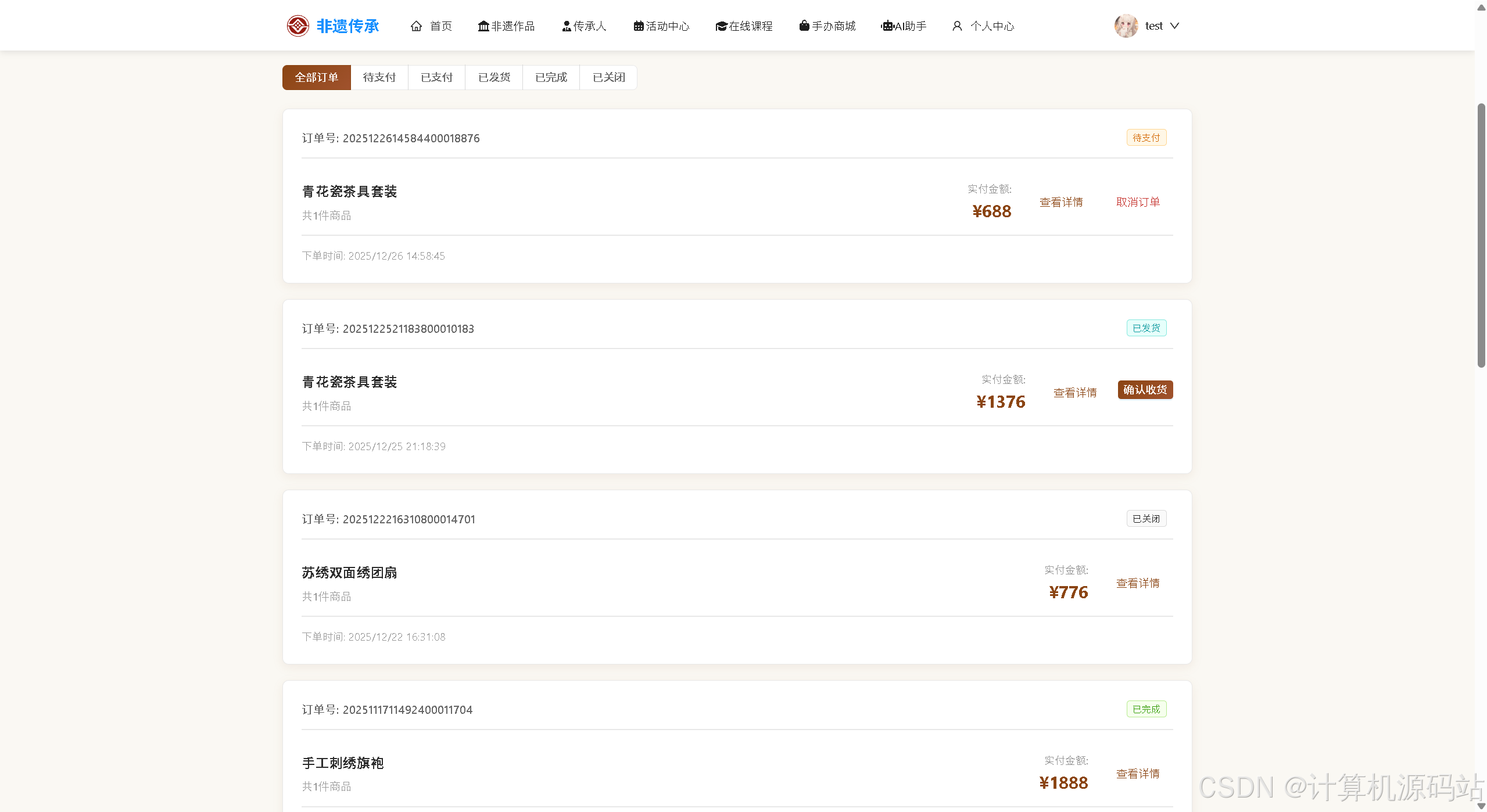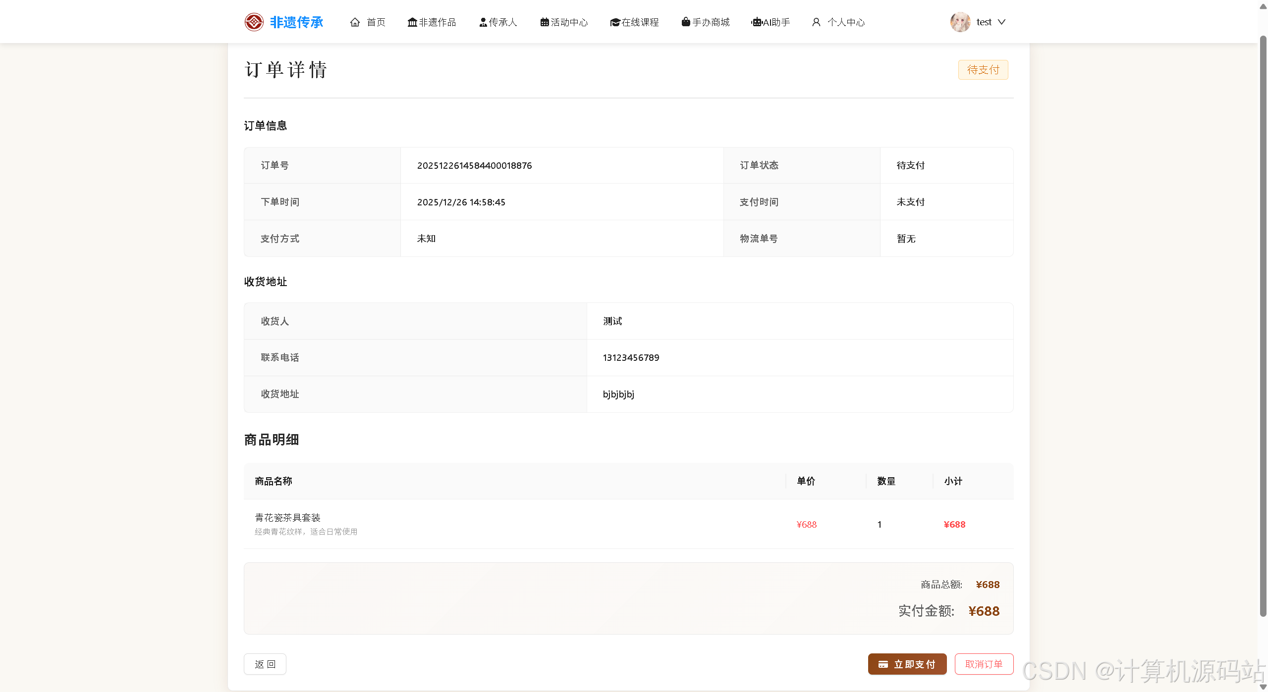 - 非遗手办商城、订单提交、支付、取消、确认收货