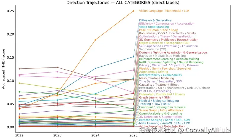 - 生成式方法持续扩张: 扩散模型研究从8%稳步增长至19.2%,焦点从基础生成转向可控性、蒸馏与加速。