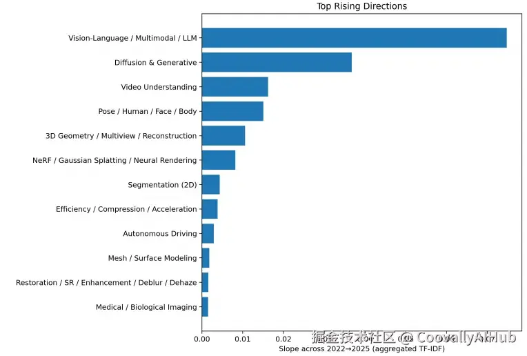 图3以条形图形式直观展示了增长最快的研究方向,视觉语言/多模态/LLM方向增长最为显著。