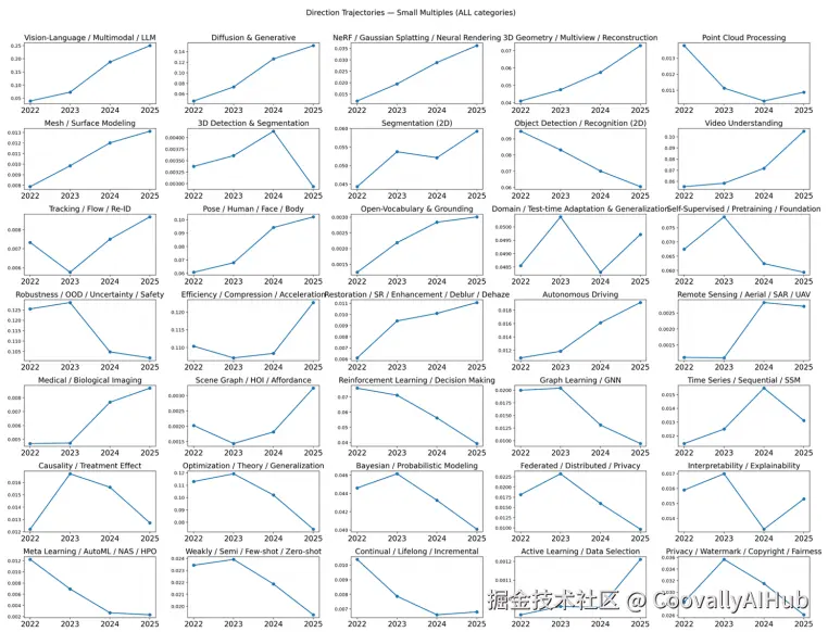 图2的小多图揭示了更细微的变化:生成式与多模态领域持续扩张并渗透至3D、视频和编辑任务;而自监督学习、元学习、图神经网络等传统范式相对份额下降或停滞。