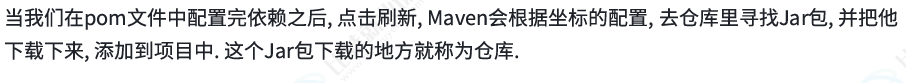 当我们在pom文件中配置完依赖之后,点击刷新,Maven会根据坐标的位置,去仓库里寻找jar包并且下载下来添加到项目中,而下载这个jar包的地方就是仓库。
