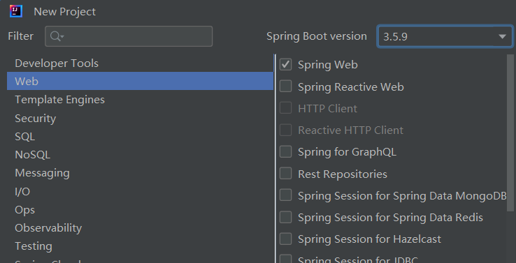 这个页面是用来选择SpringBoot版本和添加依赖的,如图:3.5.9就是Spring Boot 的版本,Spring Web就是我们添加的依赖。